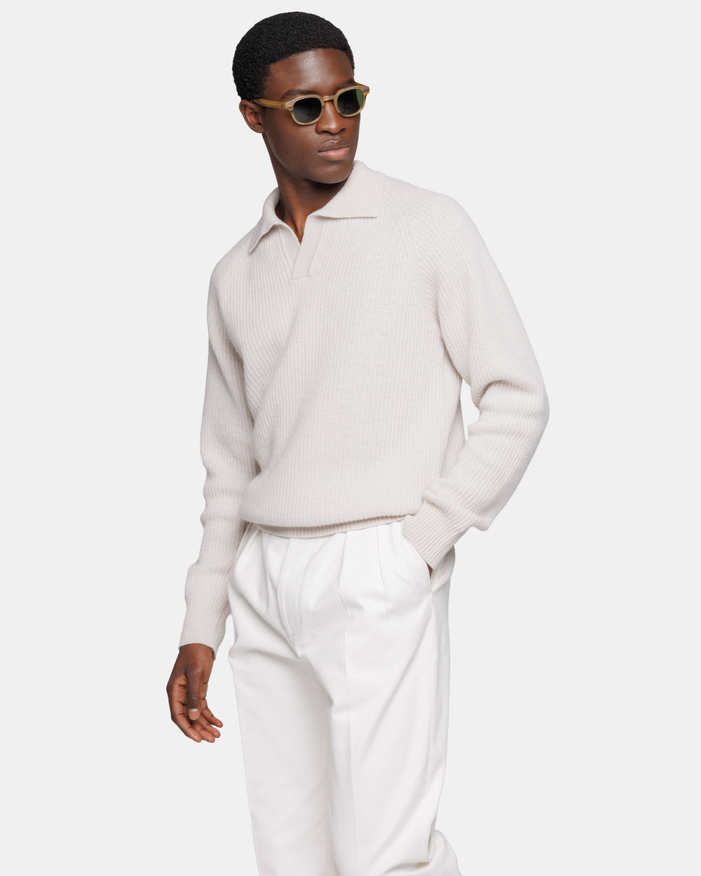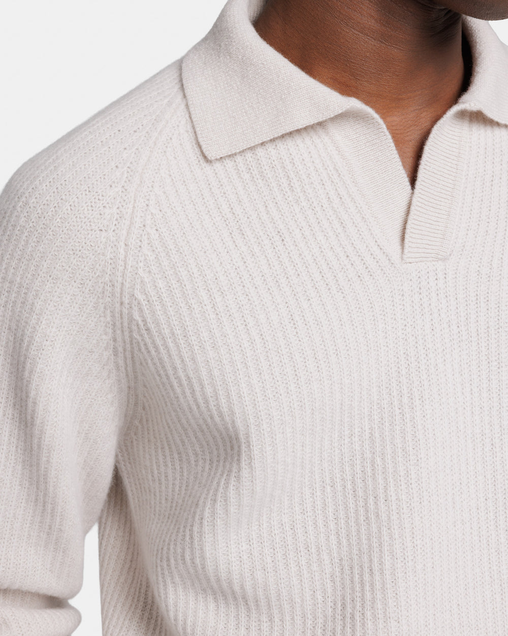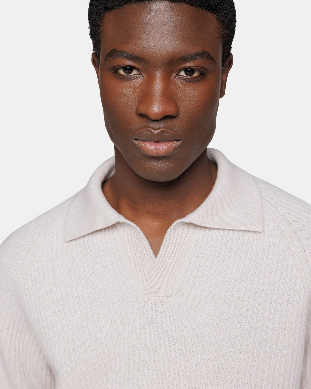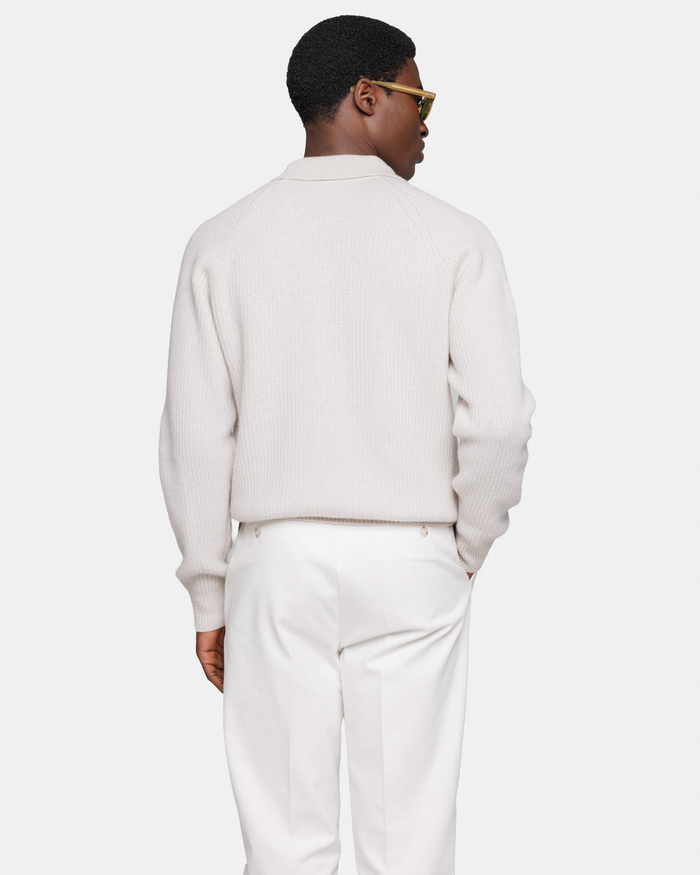 Buttonless Polo knitwear in 2-ply superfine yarn, 1/15 NM, long sleeves, solid meringue, made with luxurious Super 100's Carded Wool, a premium wool fiber known for its softness and warmth. The carded wool, subjected to the traditional carding process, gives the yarn a voluminous, soft texture and unique thermal properties, thanks to the microscopic air bubbles trapped between the fibers.