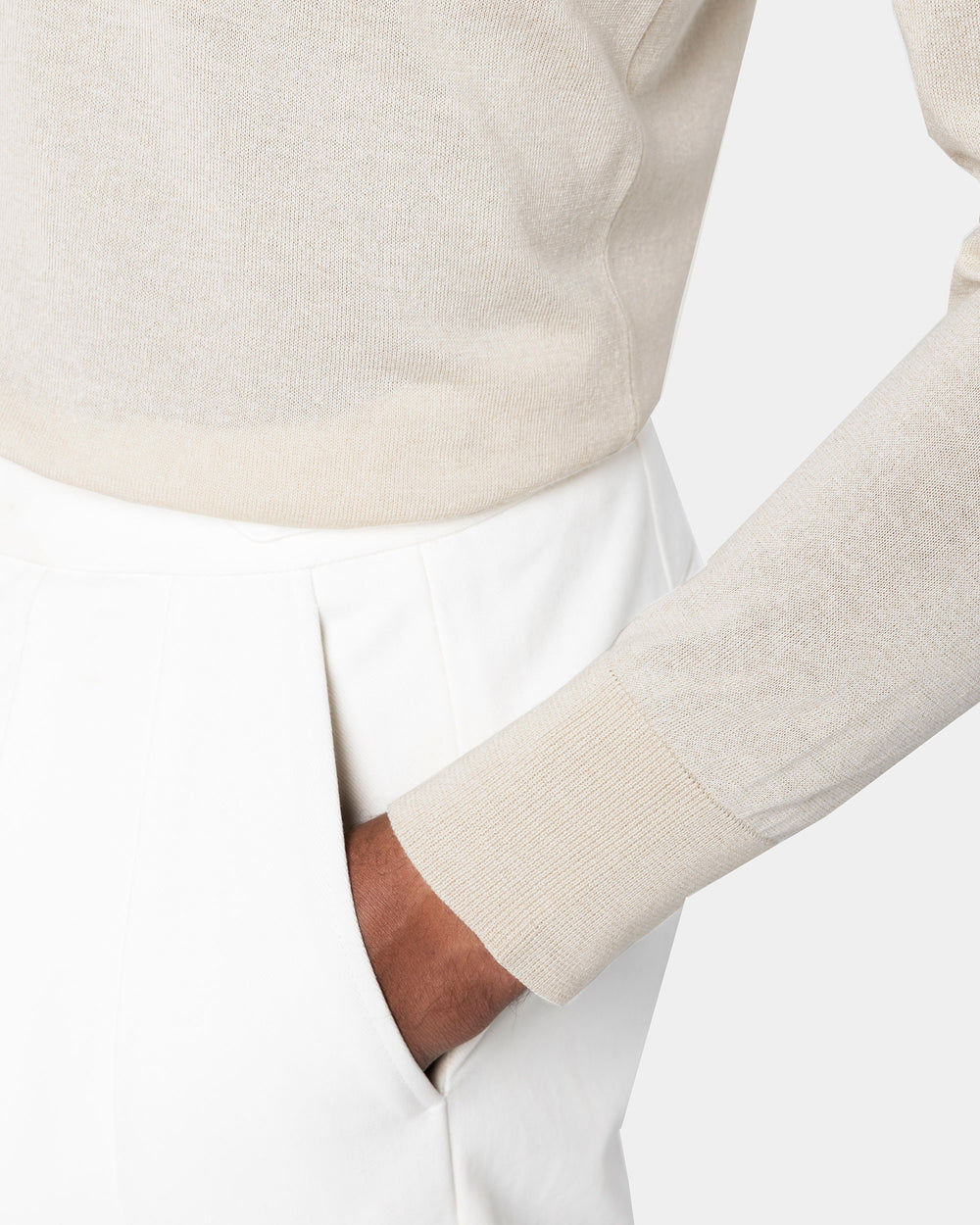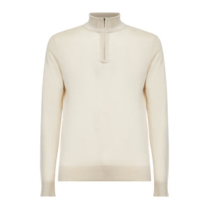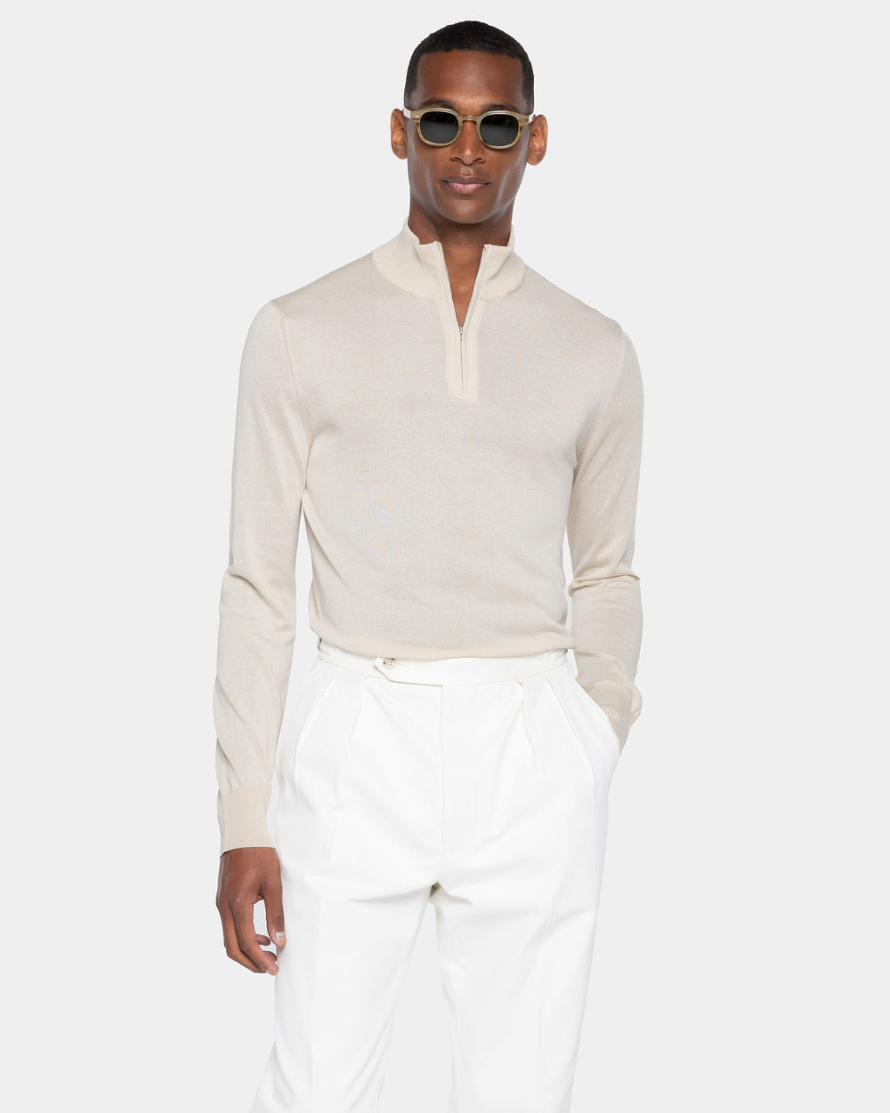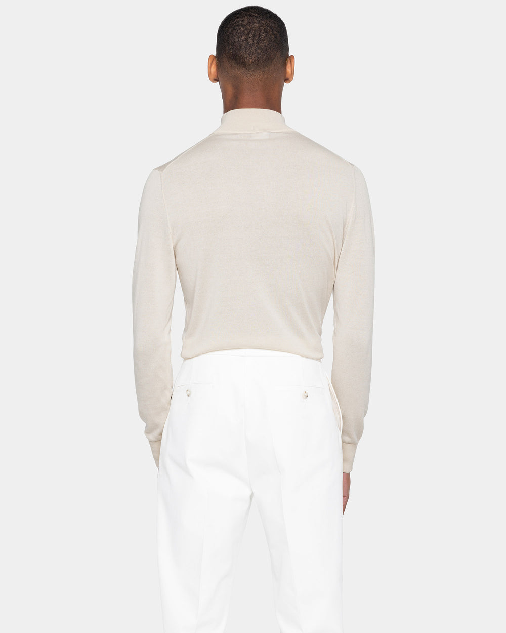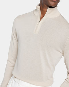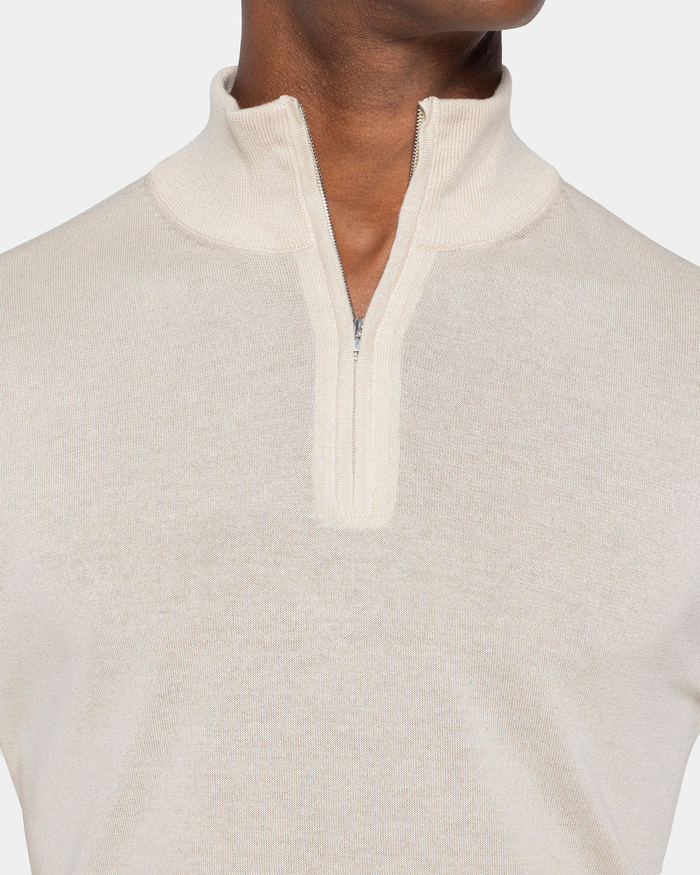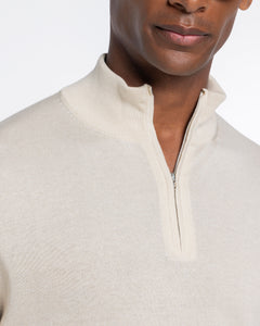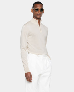 Maglia su misura rasata ad 1 filo ultra-fine dal titolo 1/30.000 manica lunga tinta unita sabbia modello lupetto con zip Riri da 20 cm nichel free, realizzata in una pregiata, brillante e morbida combinazione di finissimo cotone biologico e seta Mulberry, la più rara al mondo. Il colletto alto 7 cm dona un tocco di sartorialità aggiuntiva al capo.