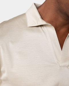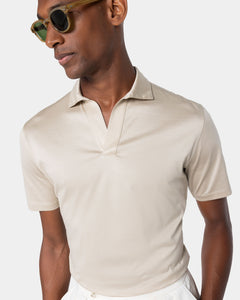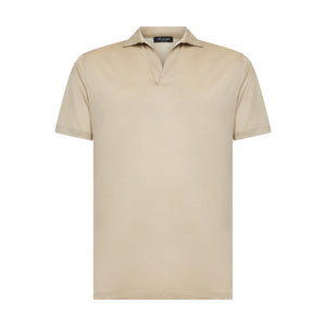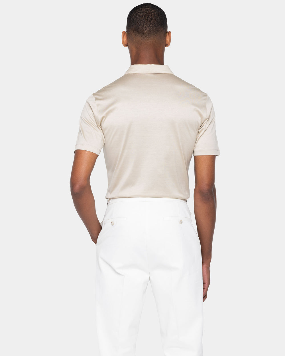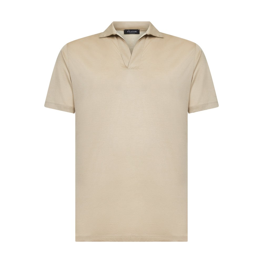 Realizzata in jersey tinto filo 100% Cotone Filoscozia®️ Makò Egiziano, titolo extra-fine 80/2, prodotto dalla tessitura italiana Tessilmaglia, questa polo senza bottoni si distingue per la leggerezza, la luminosità e una mano liscia e scorrevole: un capo prezioso e trasversale, pensato per il guardaroba contemporaneo.
