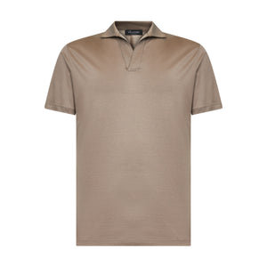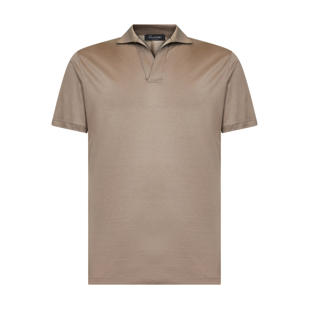 Realizzata in jersey tinto filo 100% Cotone Filoscozia®️ Makò Egiziano, titolo extra-fine 80/2, prodotto dalla tessitura italiana Tessilmaglia, questa polo senza bottoni si distingue per la leggerezza, la luminosità e una mano liscia e scorrevole: un capo prezioso e trasversale, pensato per il guardaroba contemporaneo.