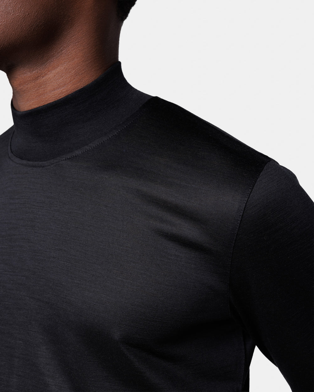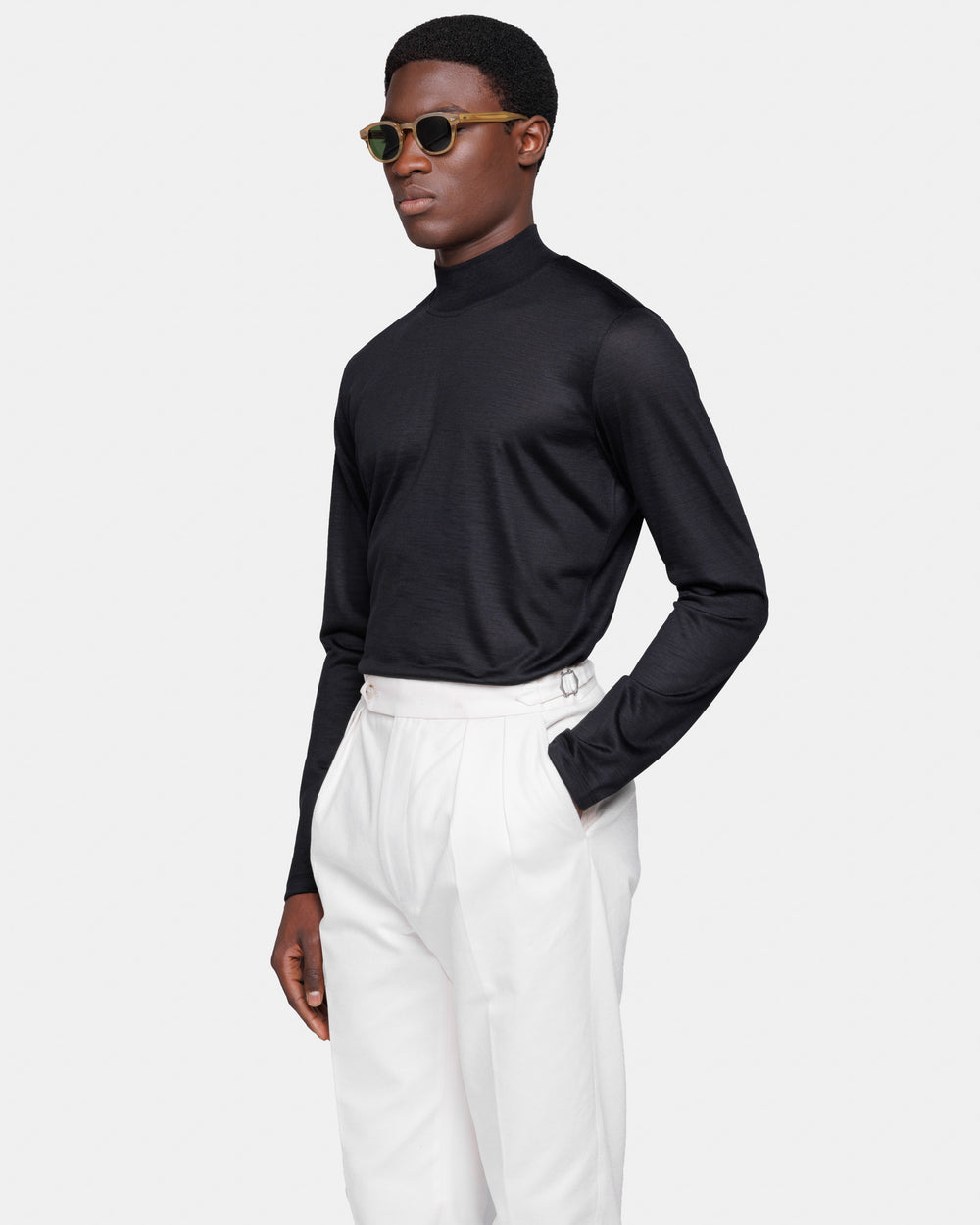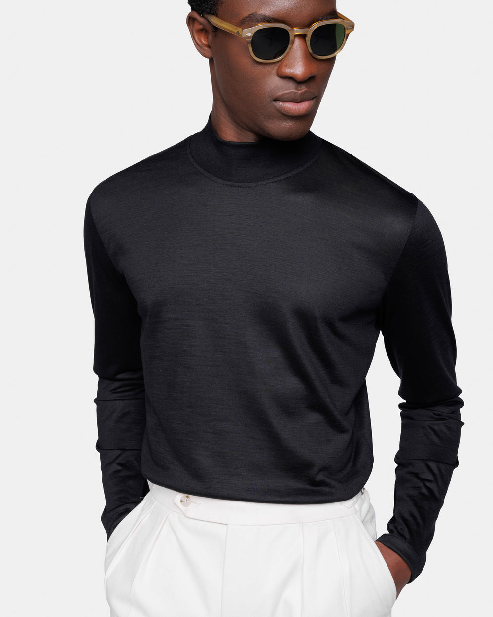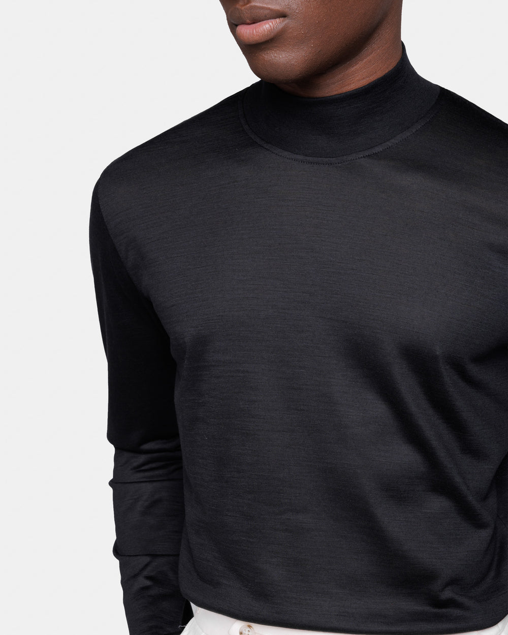 Realizzata nel pregiato filato NM 88/2, composto al 100% da Lana Merino tecnica extrafine 19 micron e trattato con processo TEC per preservarne la struttura, ridurre l'usura e garantire morbidezza e qualità durature, questa t-shirt scollo lupetto si distingue per la sua mano soffice e l'aspetto ricercato.