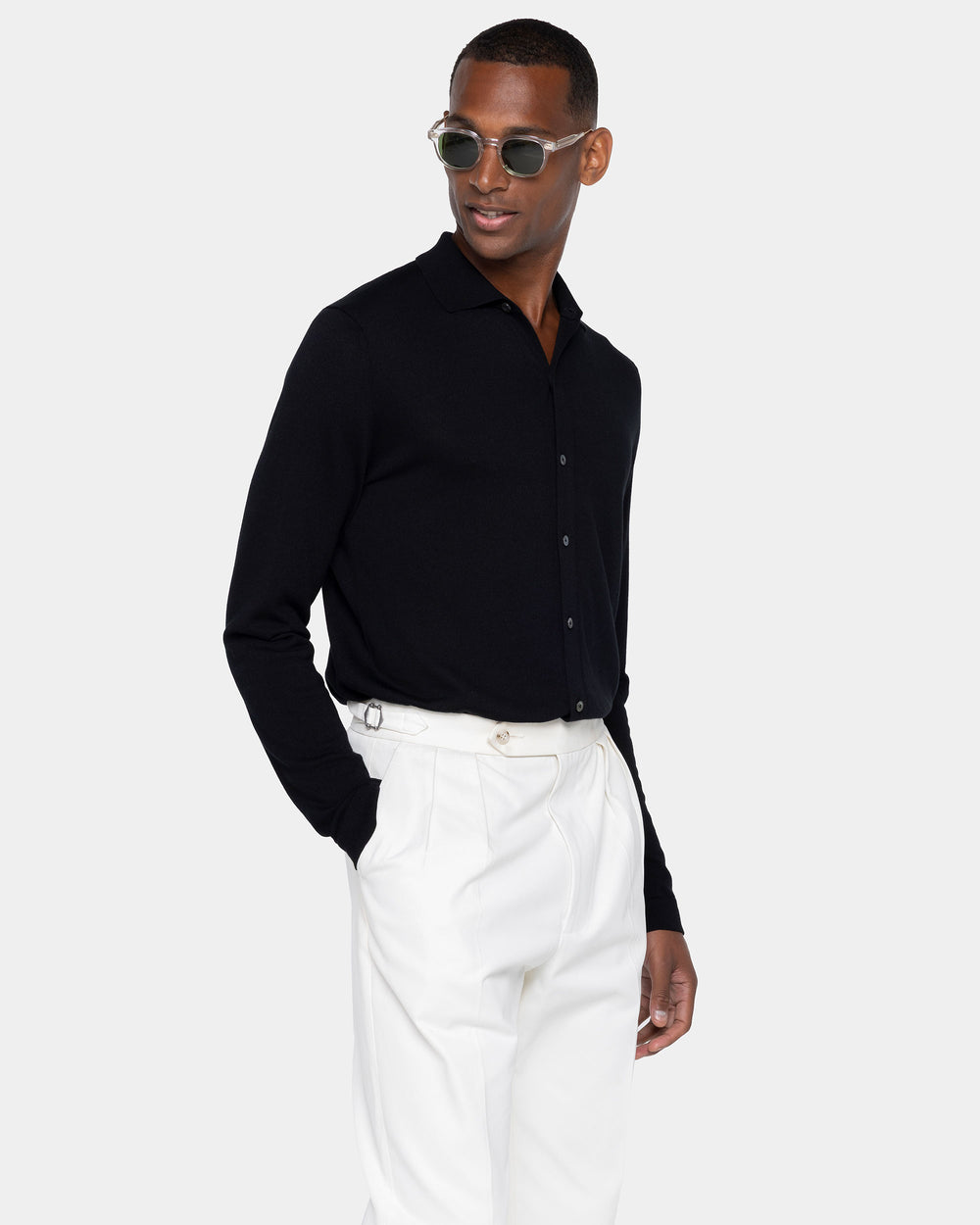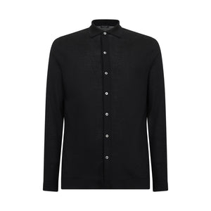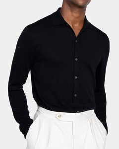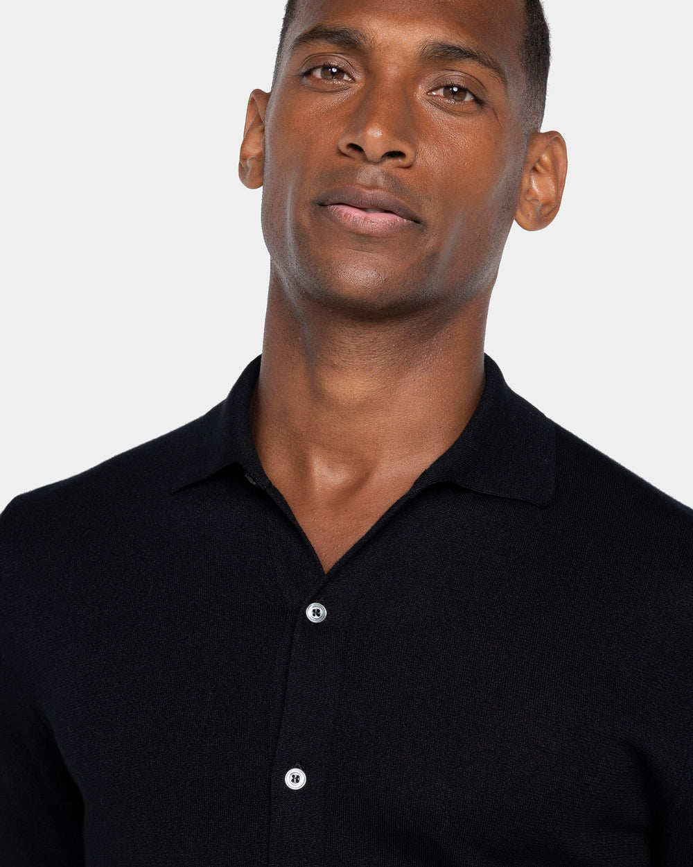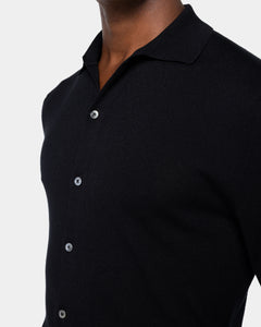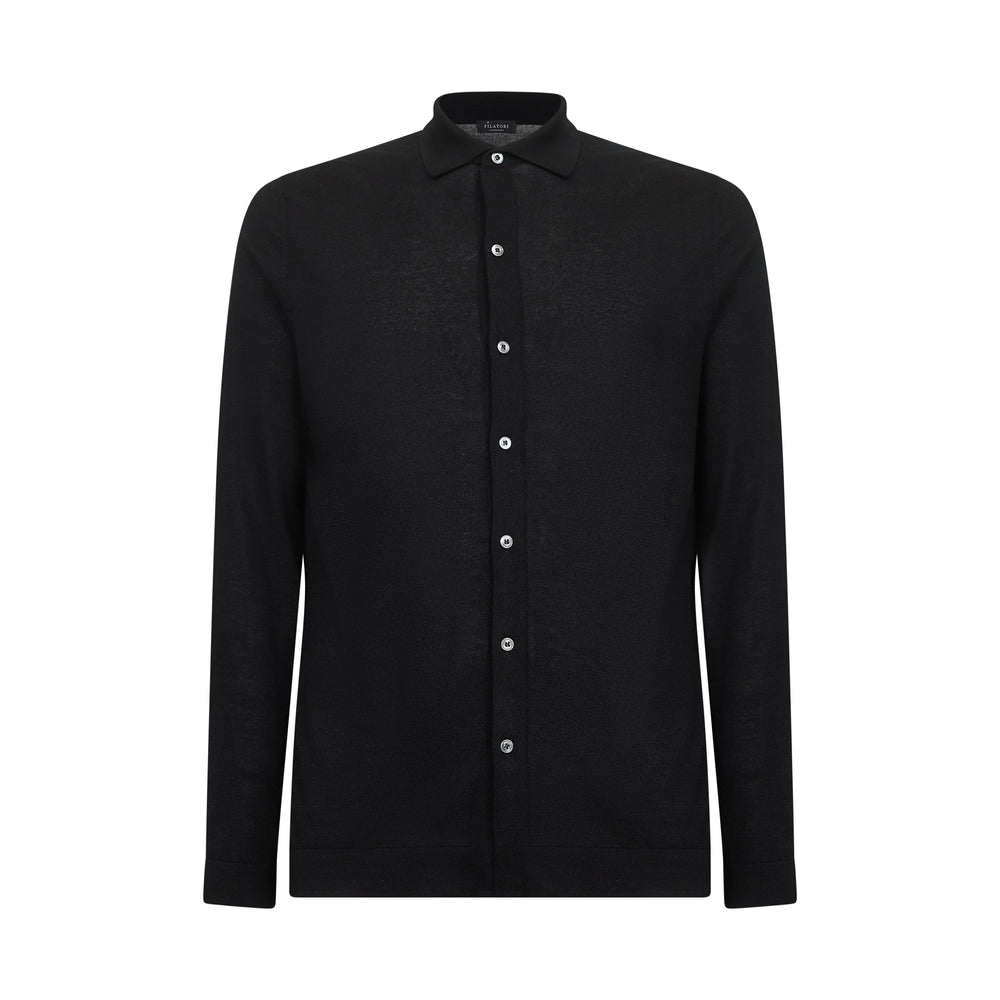 Tailor-made long-sleeved black-colored shirt with french-cut collar and grey mother-of-pearl buttons, made from a luxurious, shiny, and soft combination of ultra-fine organic cotton and Mulberry silk, the rarest in the world, in a custom-knitted single-thread fabric with a gauge of 1/30,000. The shirt is finished with 4 cm tubular cuffs and hem.