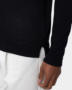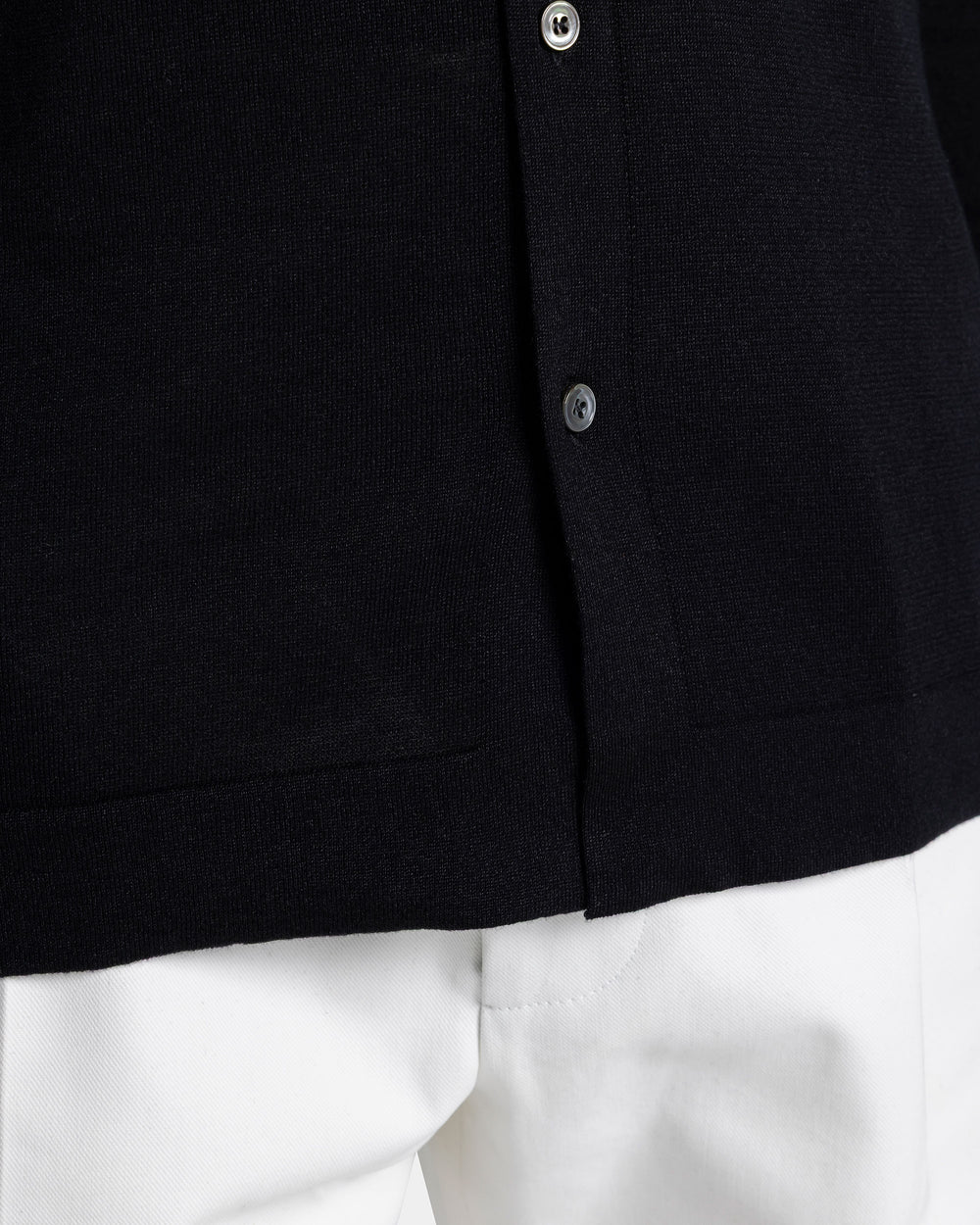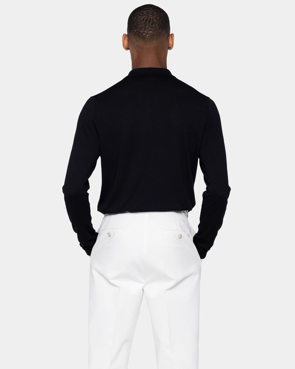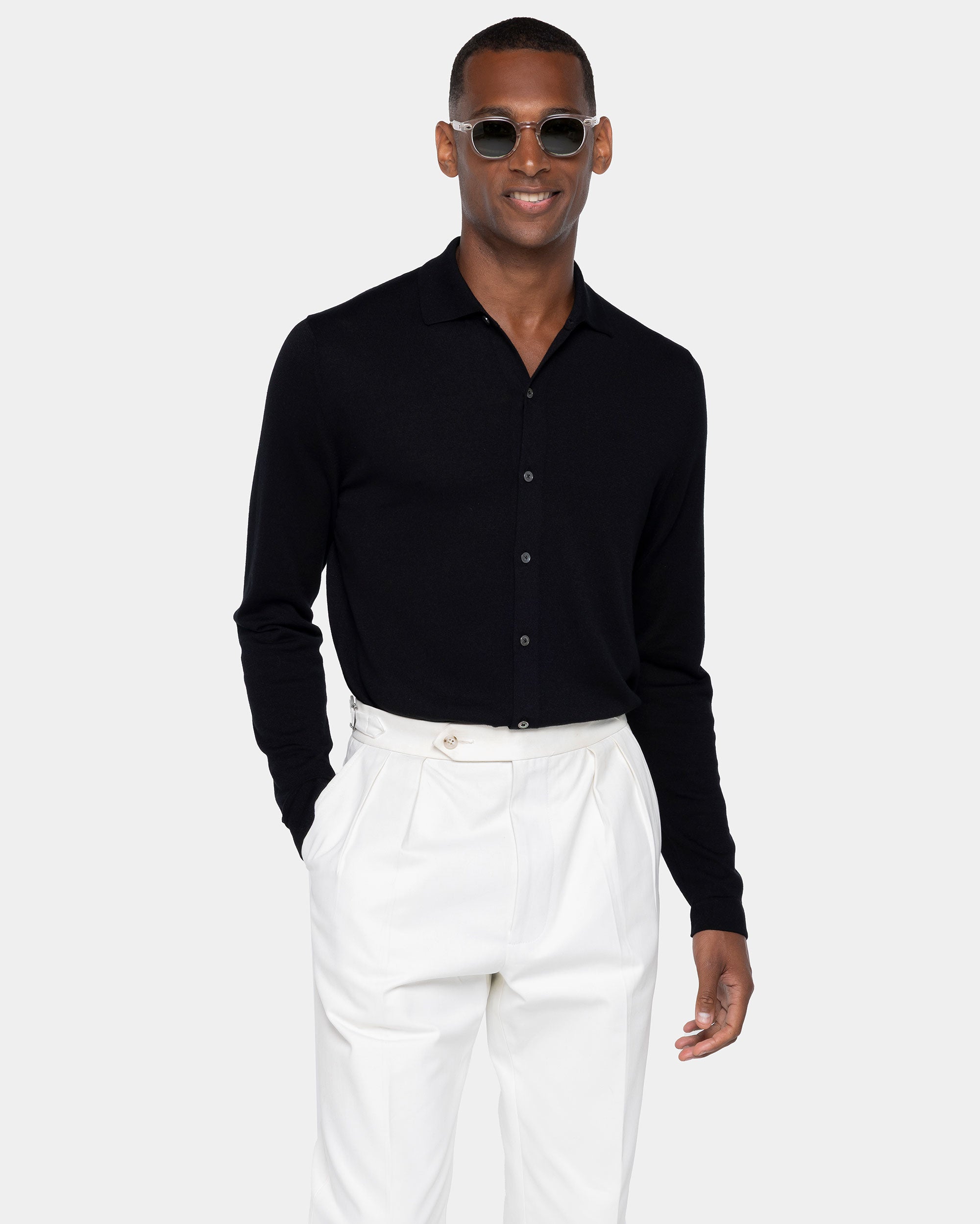 Tailor-made long-sleeved black-colored shirt with french-cut collar and grey mother-of-pearl buttons, made from a luxurious, shiny, and soft combination of ultra-fine organic cotton and Mulberry silk, the rarest in the world, in a custom-knitted single-thread fabric with a gauge of 1/30,000. The shirt is finished with 4 cm tubular cuffs and hem.