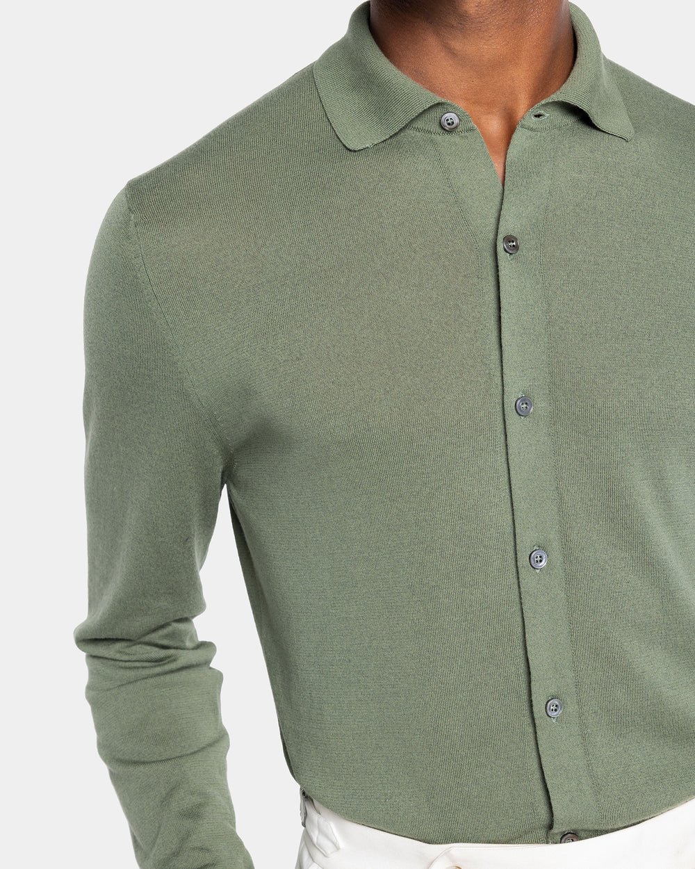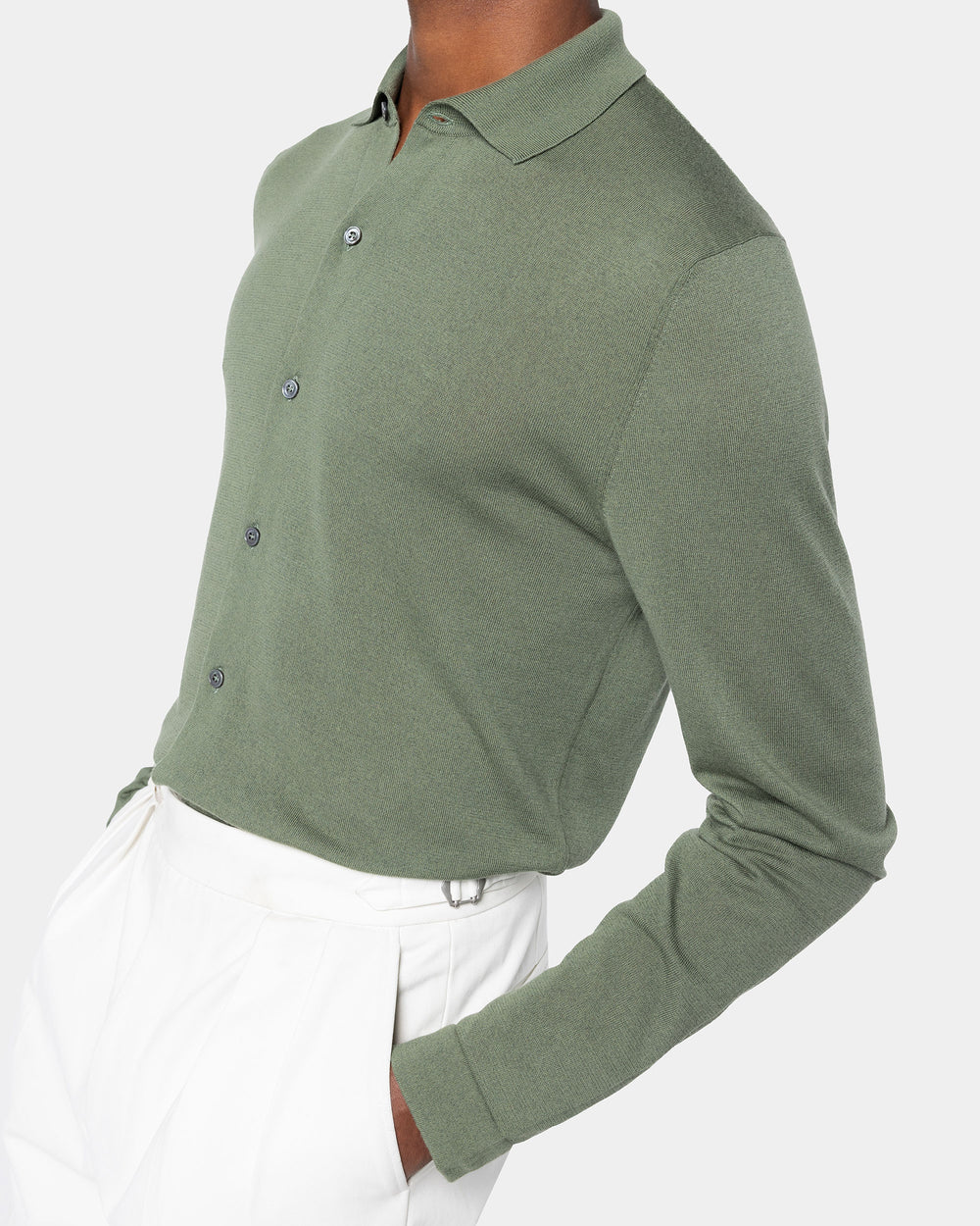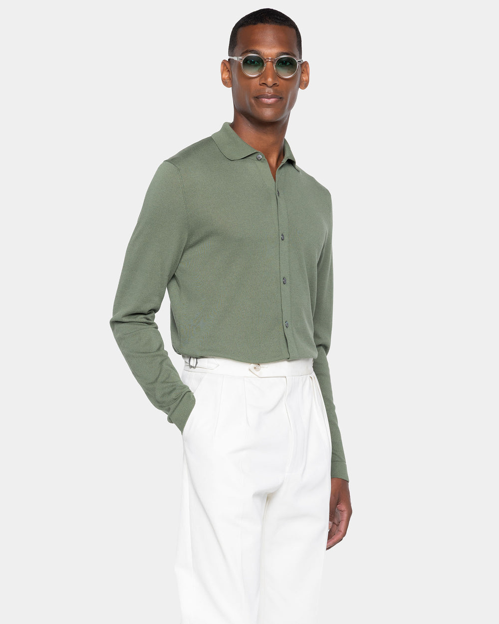 Tailor-made long-sleeved military green-colored shirt with french-cut collar and grey mother-of-pearl buttons, made from a luxurious, shiny, and soft combination of ultra-fine organic cotton and Mulberry silk, the rarest in the world, in a custom-knitted single-thread fabric with a gauge of 1/30,000. The shirt is finished with 4 cm tubular cuffs and hem.