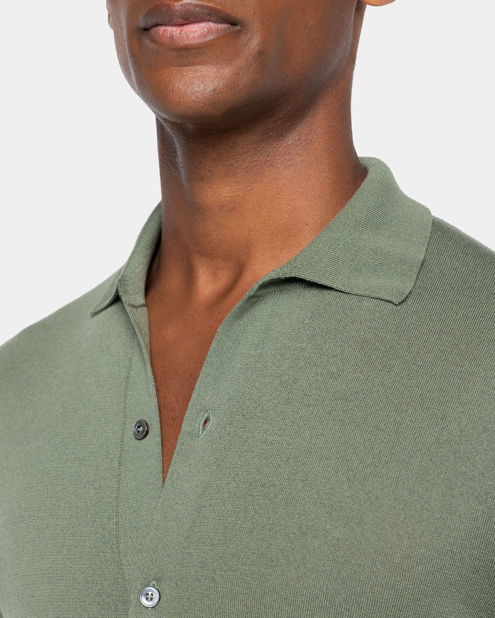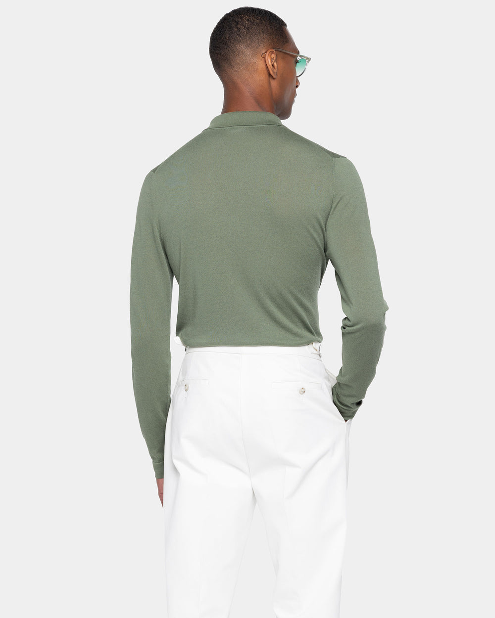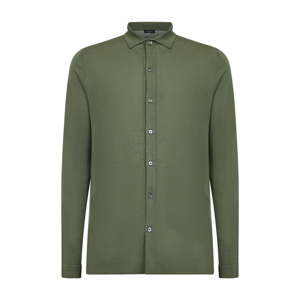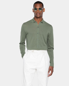 Tailor-made long-sleeved military green-colored shirt with french-cut collar and grey mother-of-pearl buttons, made from a luxurious, shiny, and soft combination of ultra-fine organic cotton and Mulberry silk, the rarest in the world, in a custom-knitted single-thread fabric with a gauge of 1/30,000. The shirt is finished with 4 cm tubular cuffs and hem.
