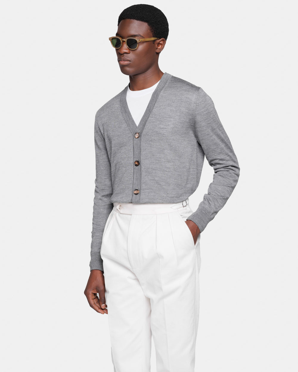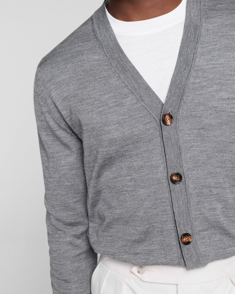 Tailor-made long sleeved cardigan with a refined V-neck and a front closure with five authentic 32 mm Horn buttons in Extrafine 2/48 Gauge Yarn, Solid Grey. Crafted from a luxurious, bright, and soft blend of 70% Extrafine Merino Wool and 30% Silk of exceptional quality.