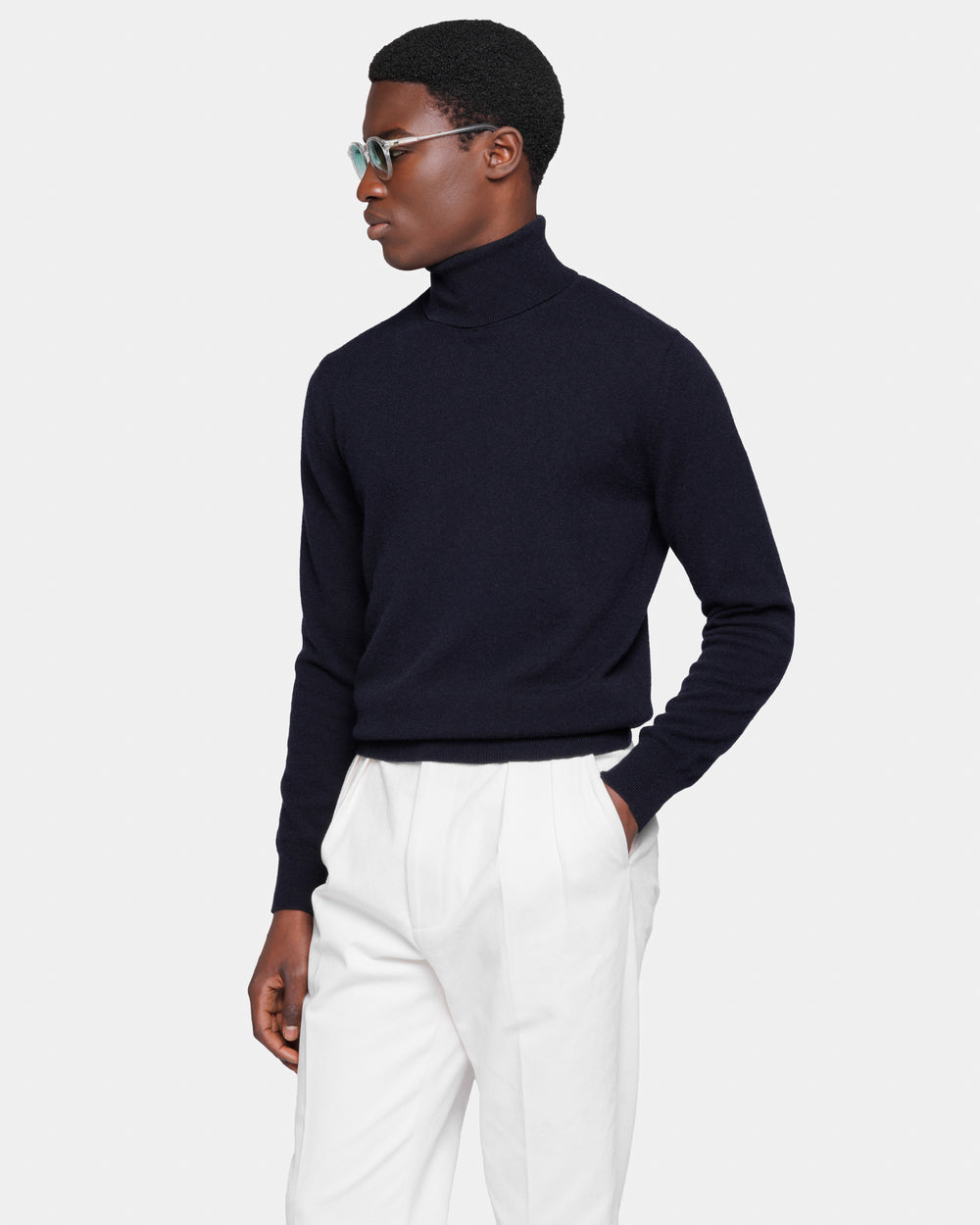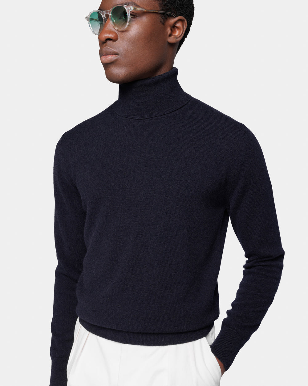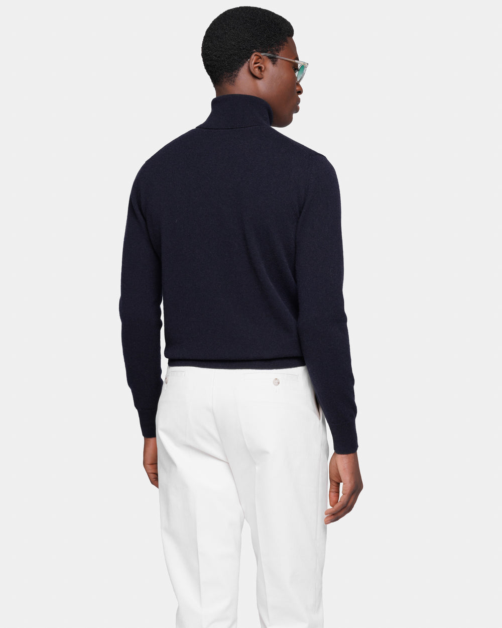 Tailor-made 1-ply turtleneck knit, 2/27 yarn gauge, long sleeves, in blue color, made from a precious, refined, and ultra-fine pure cashmere Crown Reserve fiber coming from the most remote regions of Mongolia, then reaching the mills of Quarona Sesia in Piedmont, where it is skillfully processed by the world’s most prestigious spinning mill to give life to a 2/27 carded yarn.