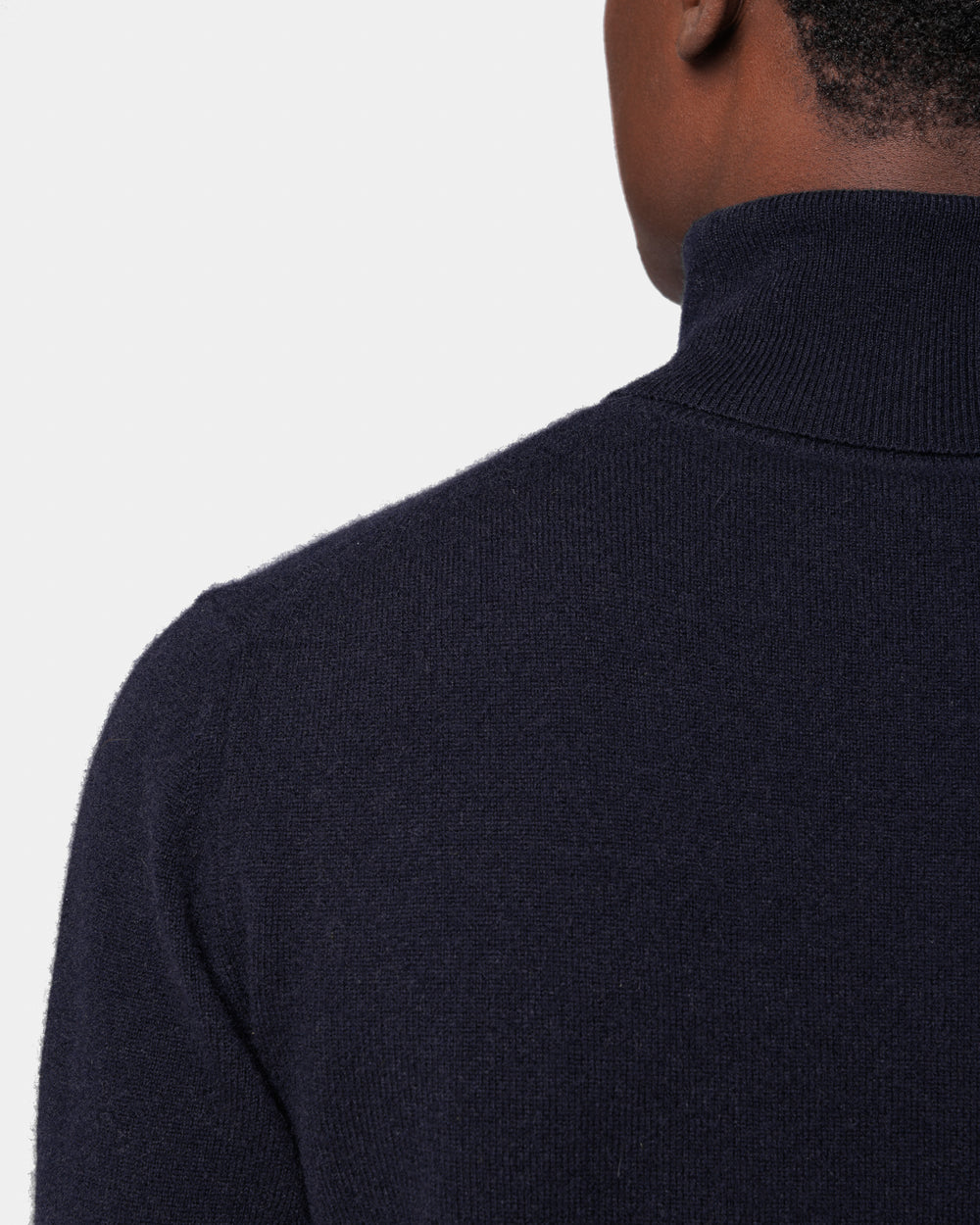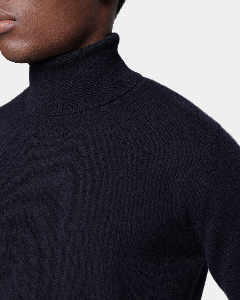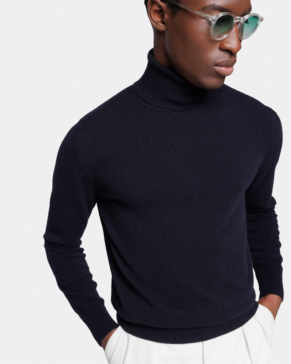 Tailor-made 1-ply turtleneck knit, 2/27 yarn gauge, long sleeves, in blue color, made from a precious, refined, and ultra-fine pure cashmere Crown Reserve fiber coming from the most remote regions of Mongolia, then reaching the mills of Quarona Sesia in Piedmont, where it is skillfully processed by the world’s most prestigious spinning mill to give life to a 2/27 carded yarn.