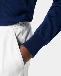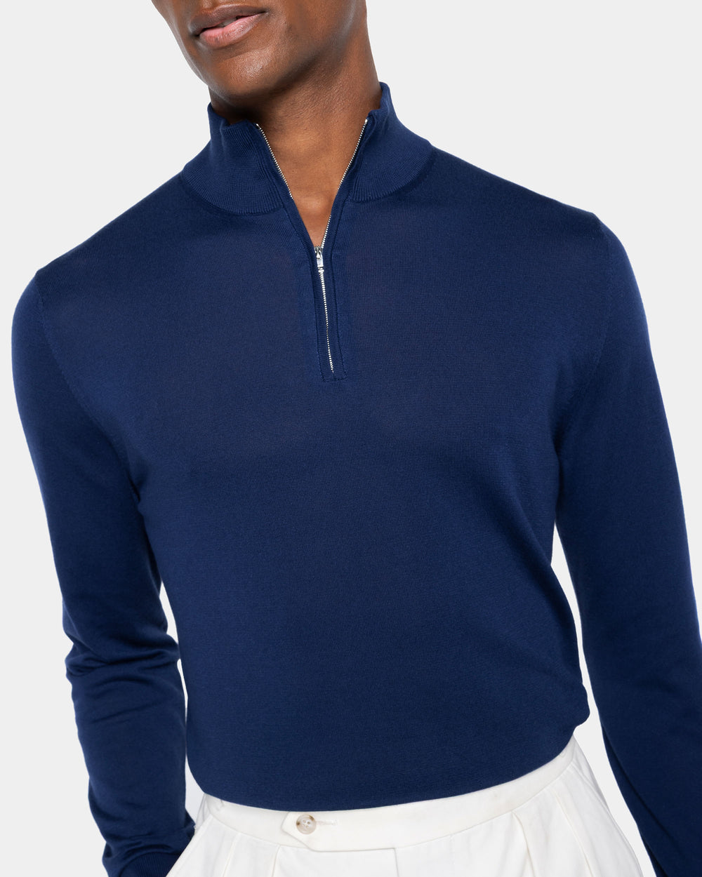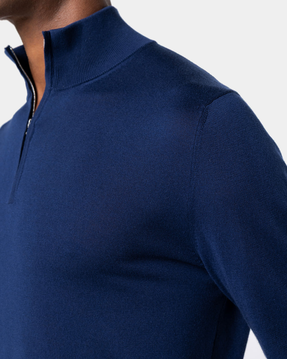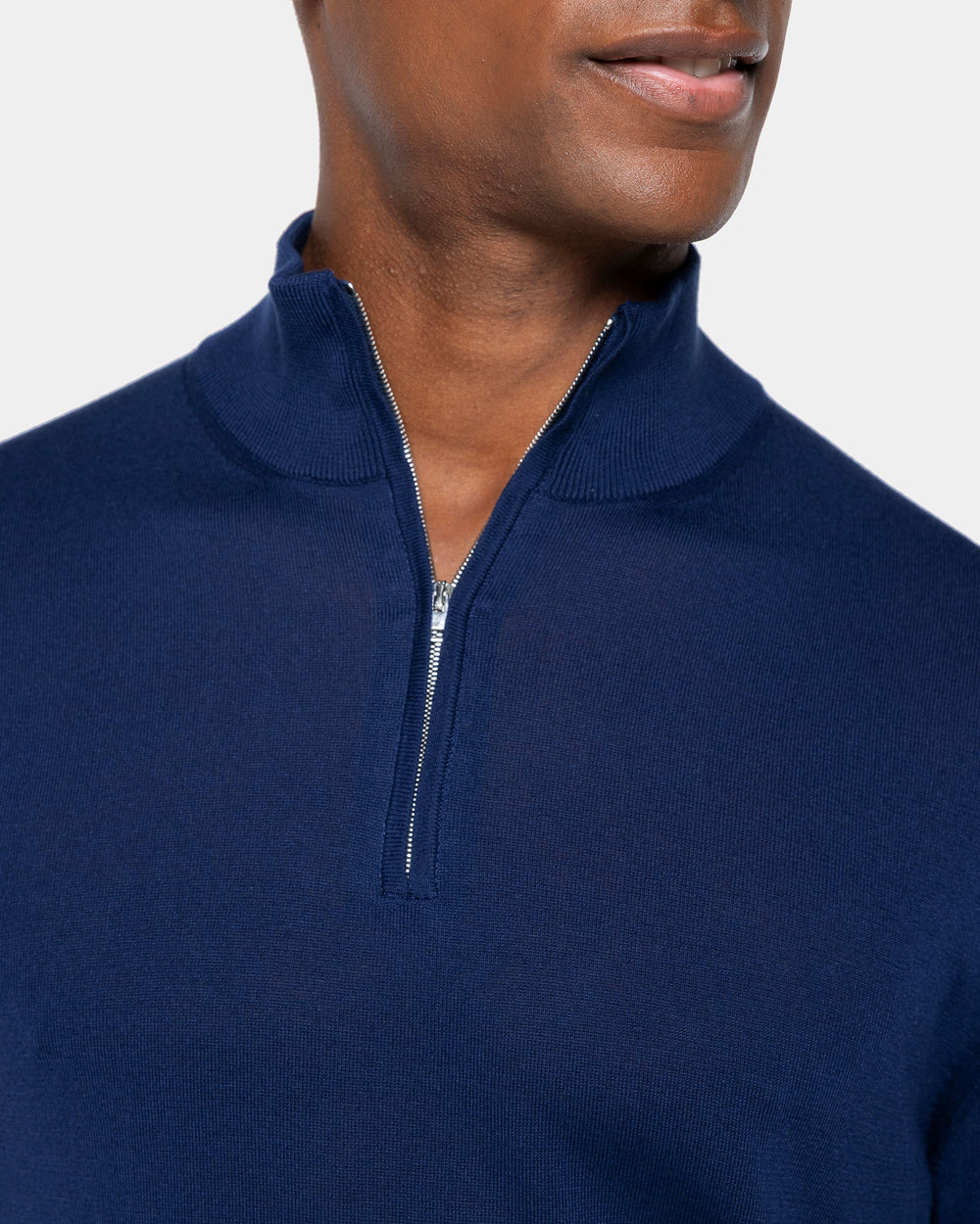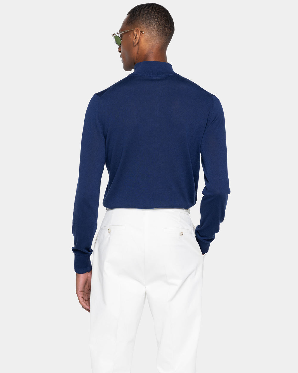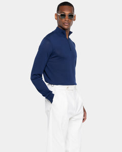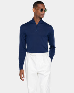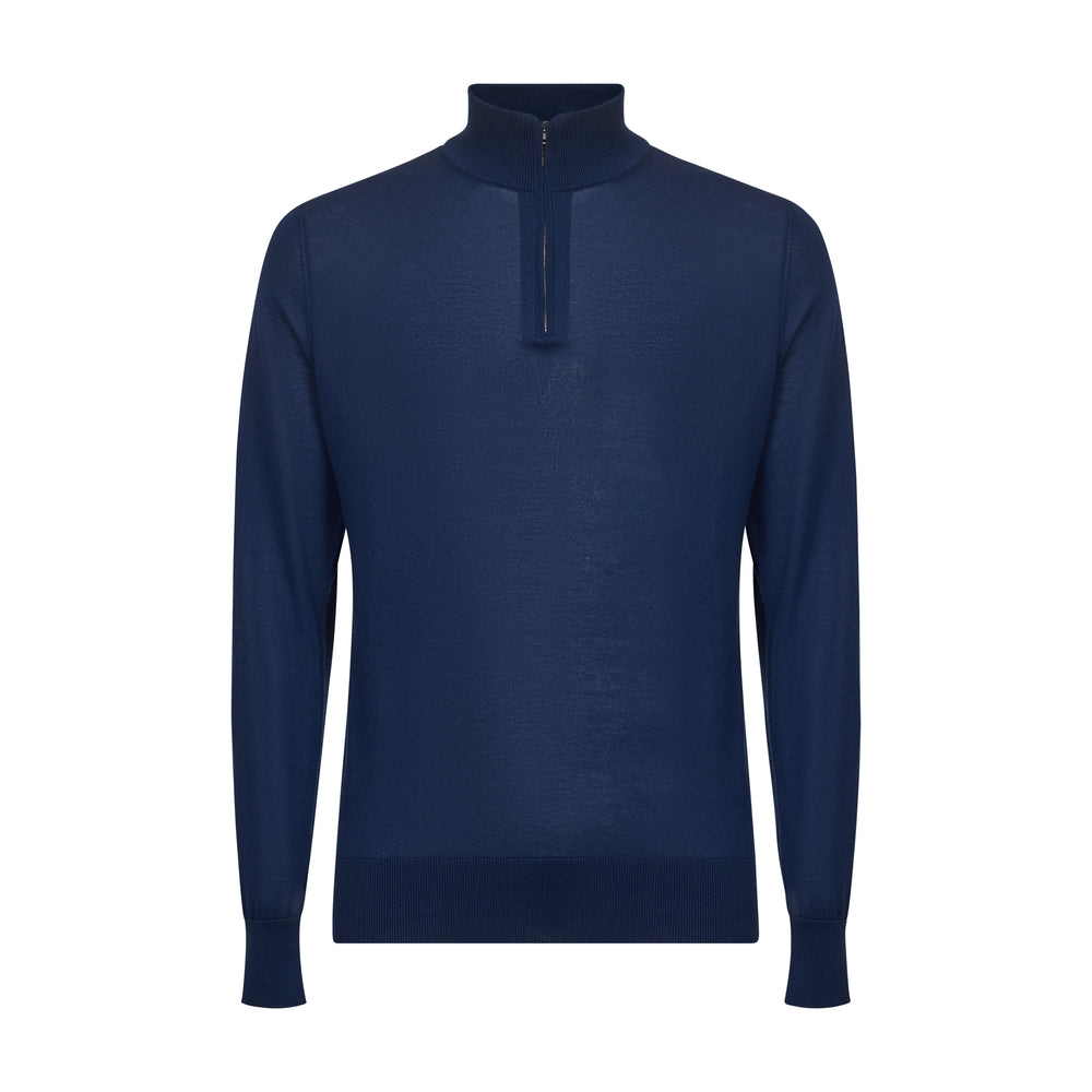 Tailor-made long-sleeve blue marine-colored zip highneck knit with 20 cm nickel-free Riri zip, made from a luxurious, shiny, and soft combination of ultra-fine organic cotton and Mulberry silk, the rarest in the world, in a custom-knitted single-thread fabric with a gauge of 1/30,000. The 7 cm high collar adds an extra touch of tailoring to the garment.