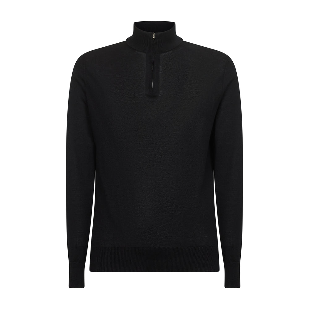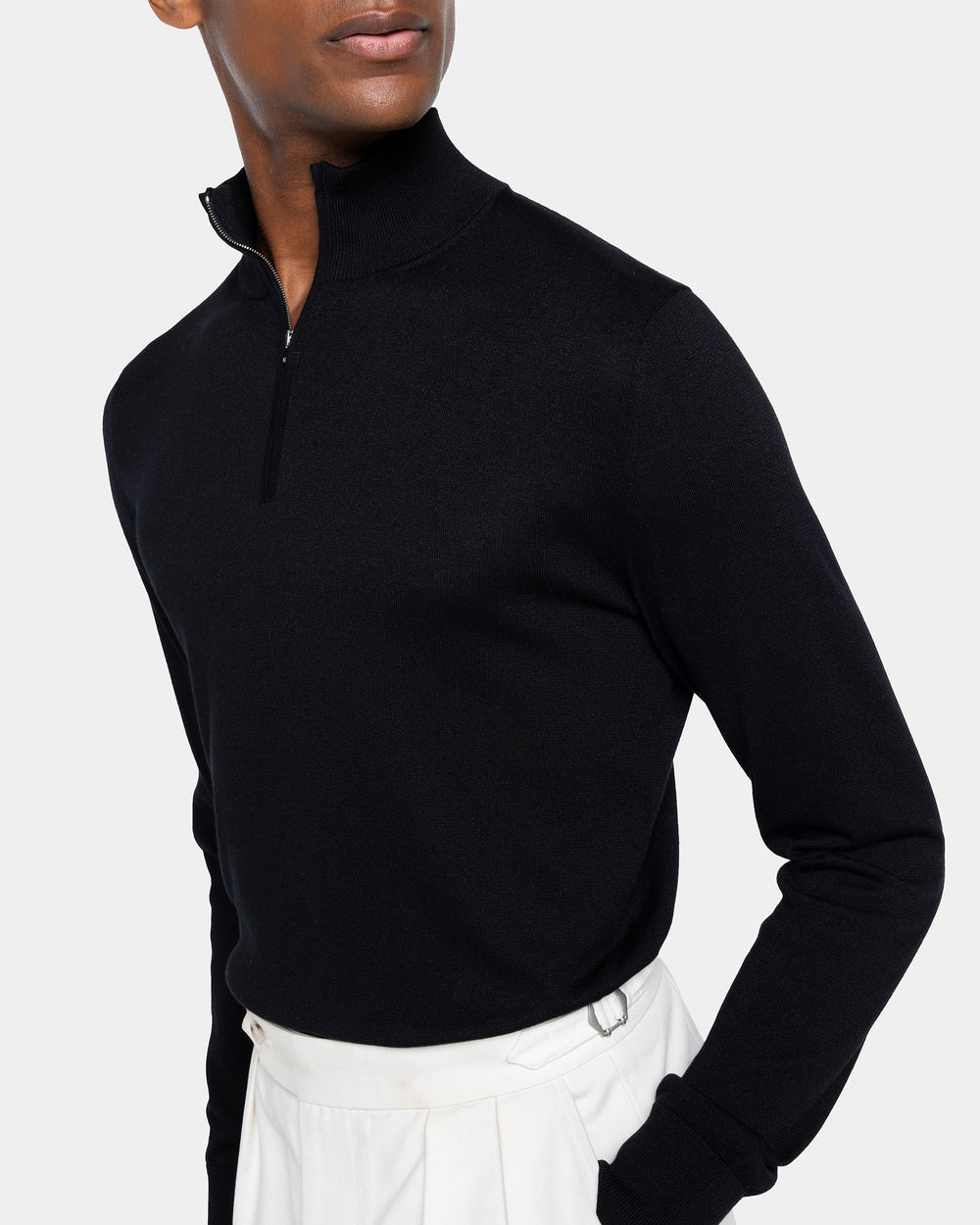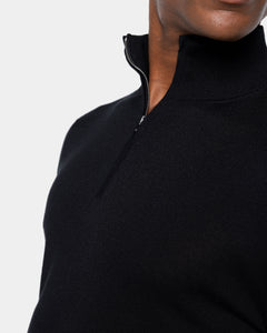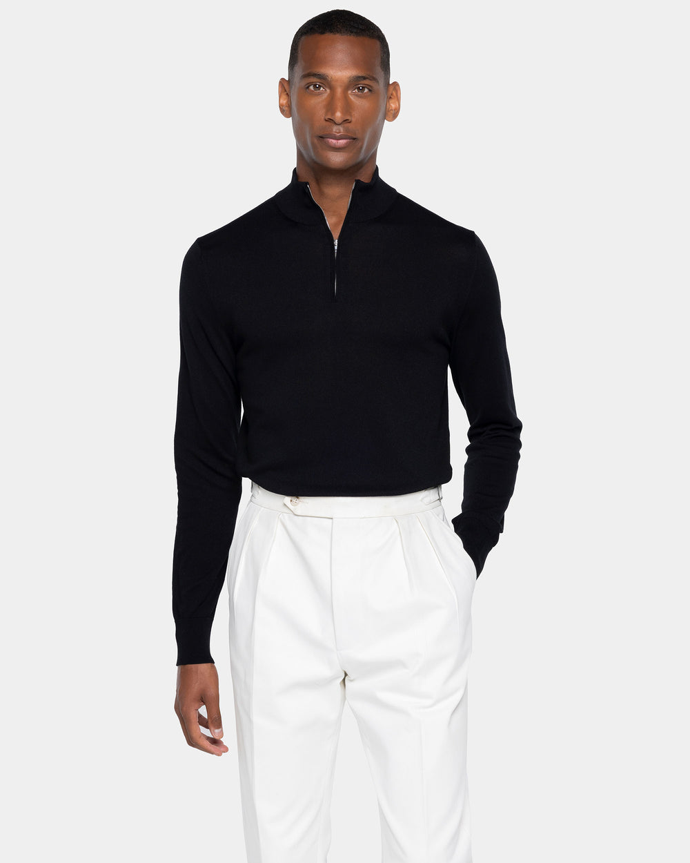 Tailor-made long-sleeve black-colored half zip knit with 20 cm nickel-free Riri zip, made from a luxurious, shiny, and soft combination of ultra-fine organic cotton and Mulberry silk, the rarest in the world, in a custom-knitted single-thread fabric with a gauge of 1/30,000. The 7 cm high collar adds an extra touch of tailoring to the garment.