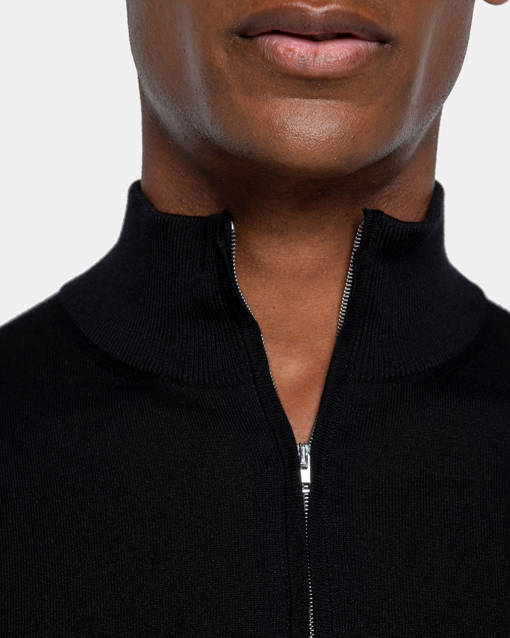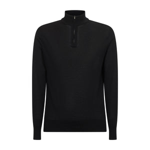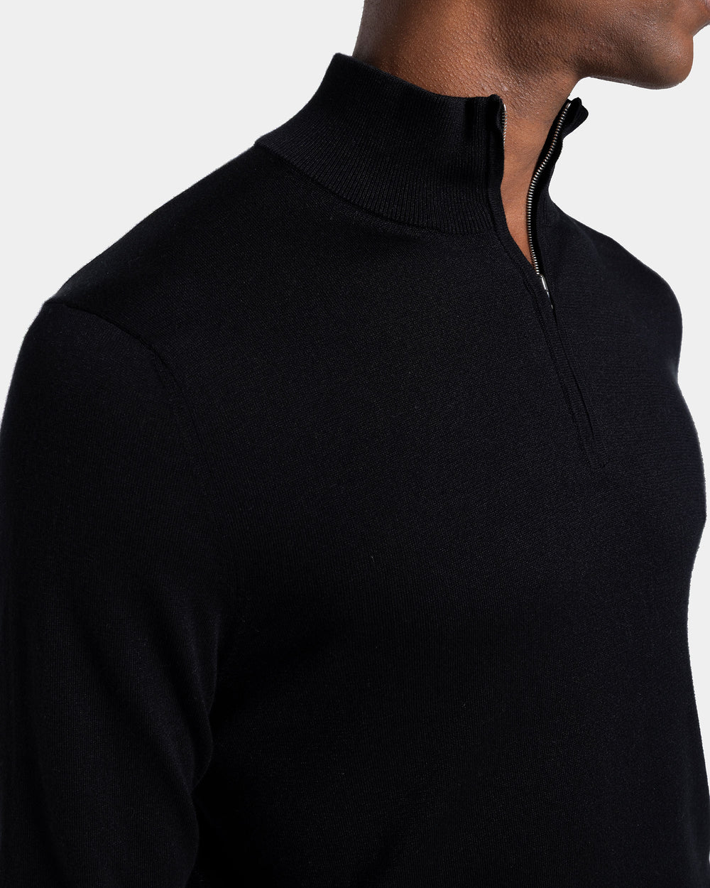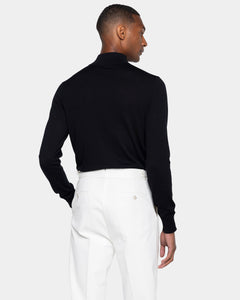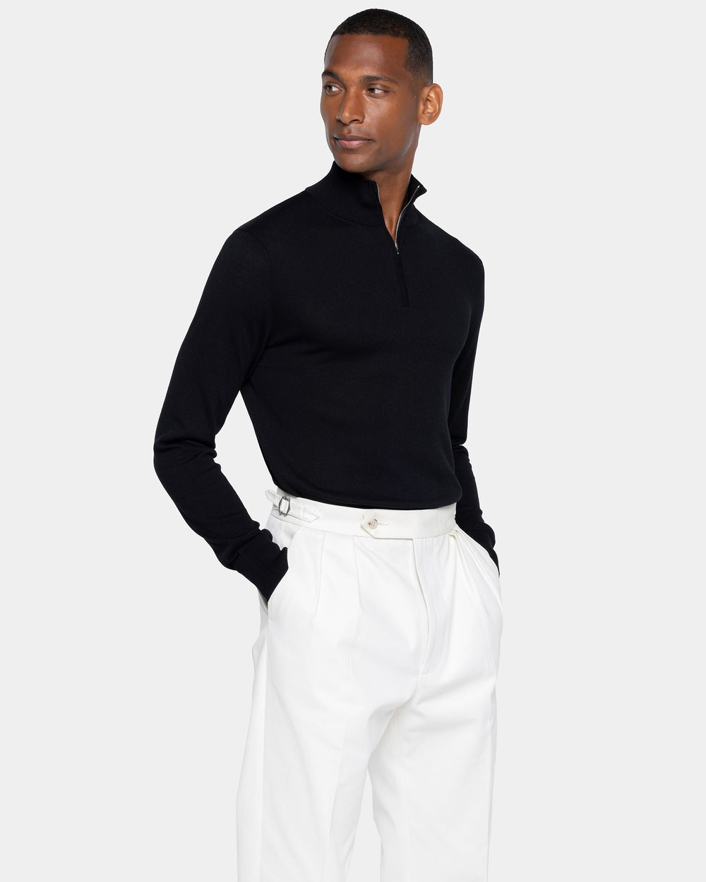 Tailor-made long-sleeve black-colored half zip knit with 20 cm nickel-free Riri zip, made from a luxurious, shiny, and soft combination of ultra-fine organic cotton and Mulberry silk, the rarest in the world, in a custom-knitted single-thread fabric with a gauge of 1/30,000. The 7 cm high collar adds an extra touch of tailoring to the garment.