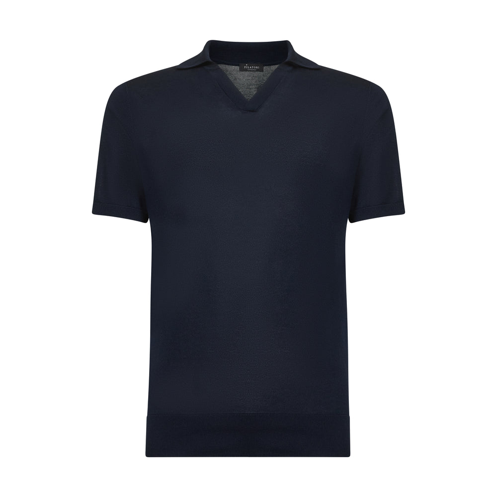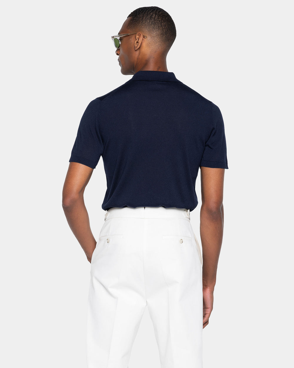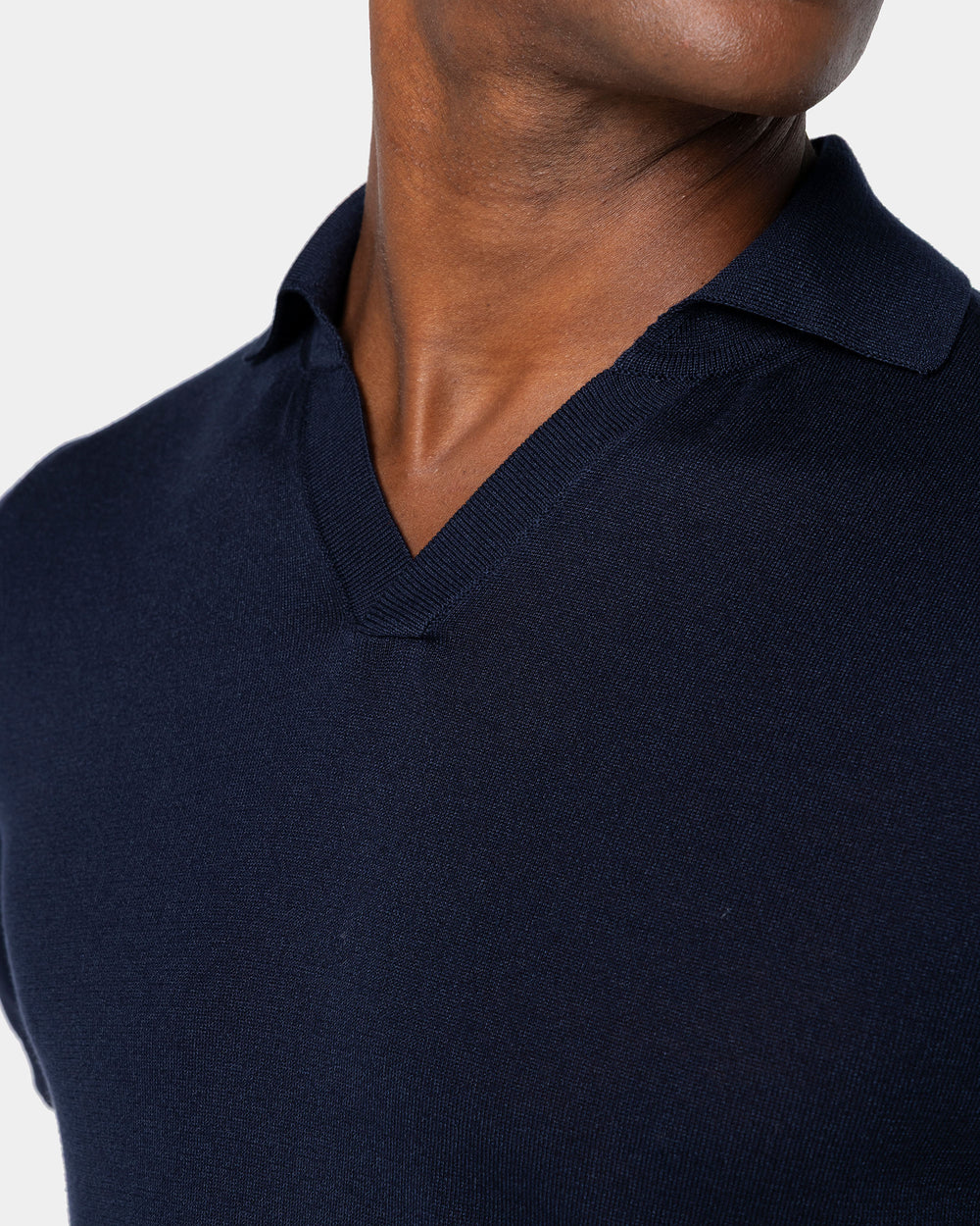 Tailor-made half-sleeve Blue-colored buttonless polo knitwear, made from a luxurious, shiny, and soft combination of ultra-fine organic cotton and Mulberry silk, the rarest in the world, in a custom-knitted single-thread fabric with a gauge of 1/30,000.
