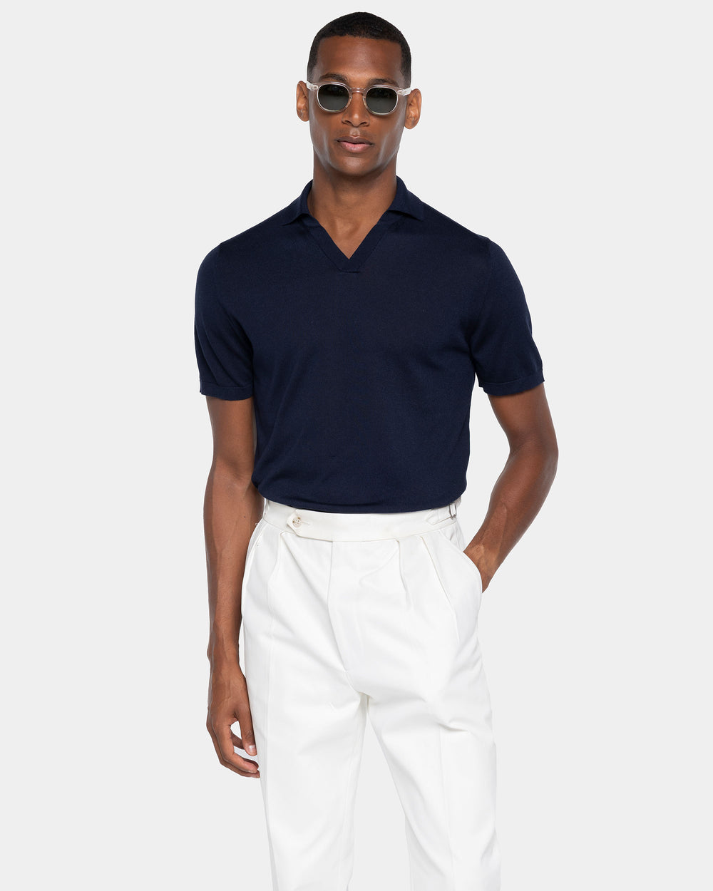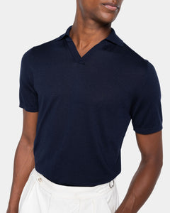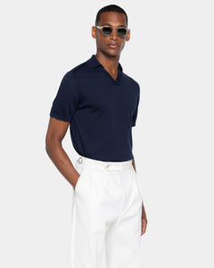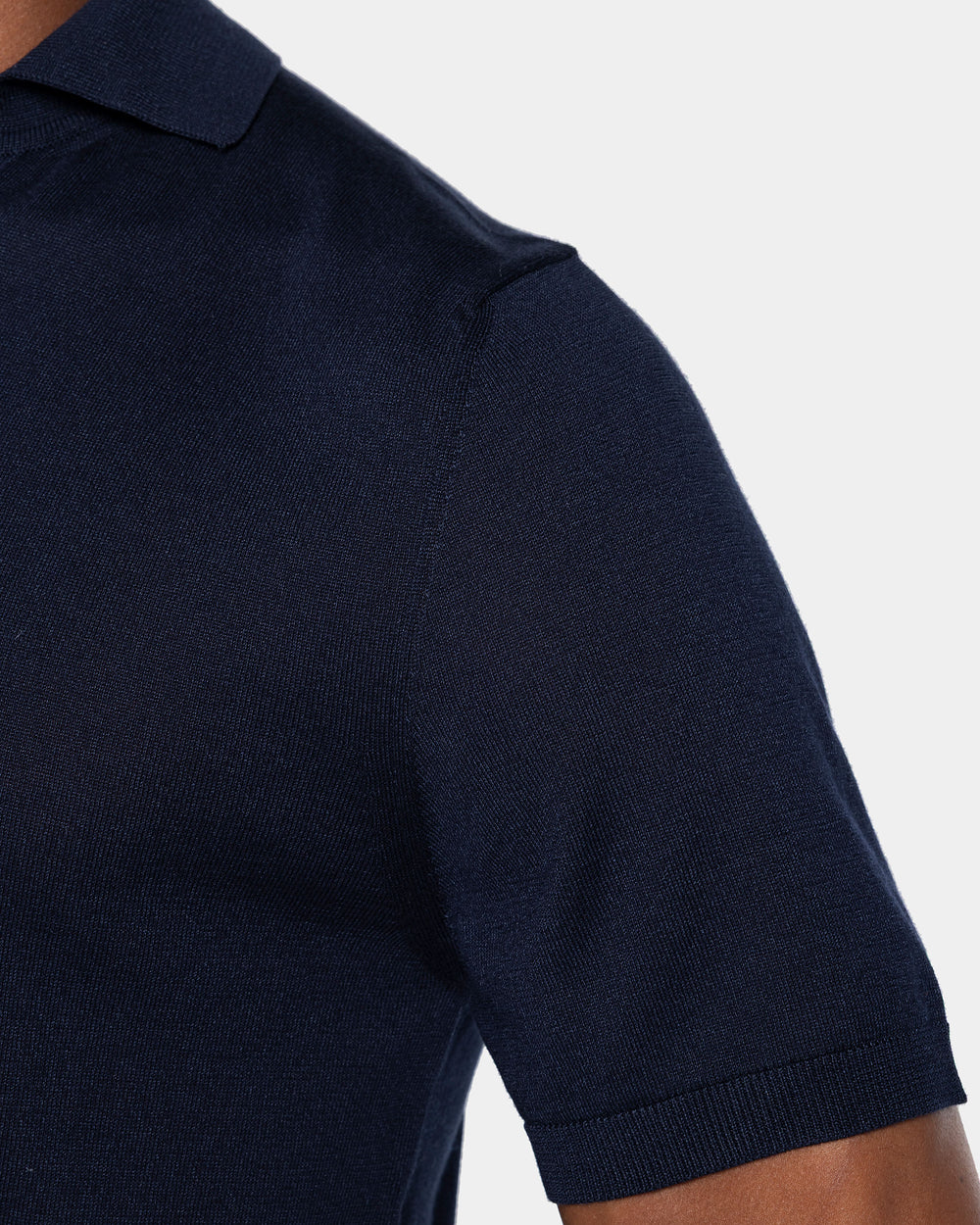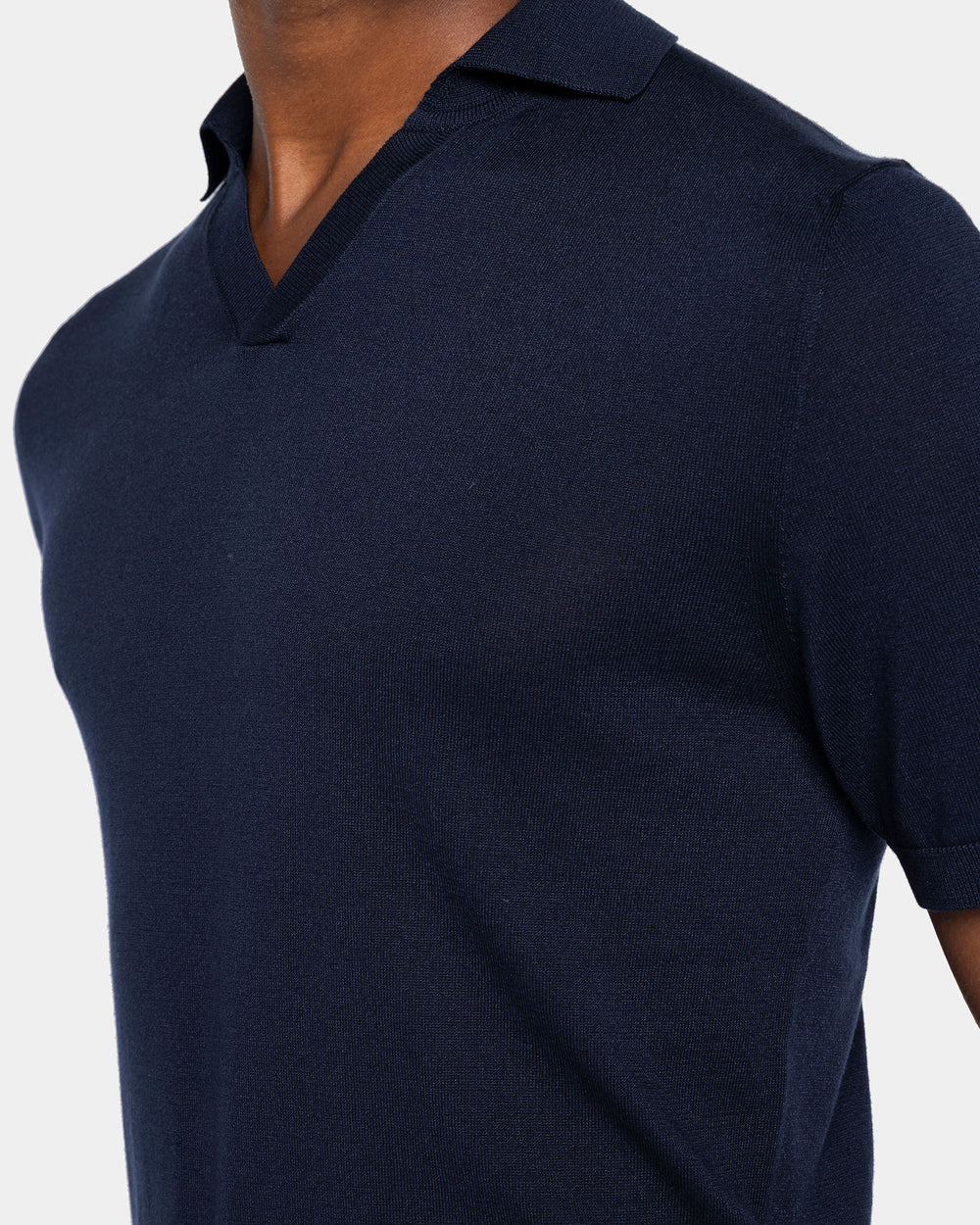 Tailor-made half-sleeve Blue-colored buttonless polo knitwear, made from a luxurious, shiny, and soft combination of ultra-fine organic cotton and Mulberry silk, the rarest in the world, in a custom-knitted single-thread fabric with a gauge of 1/30,000.