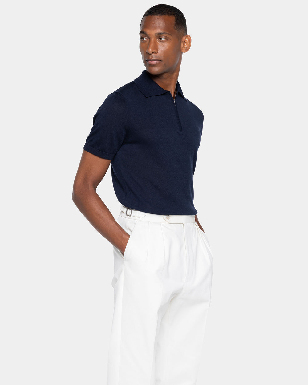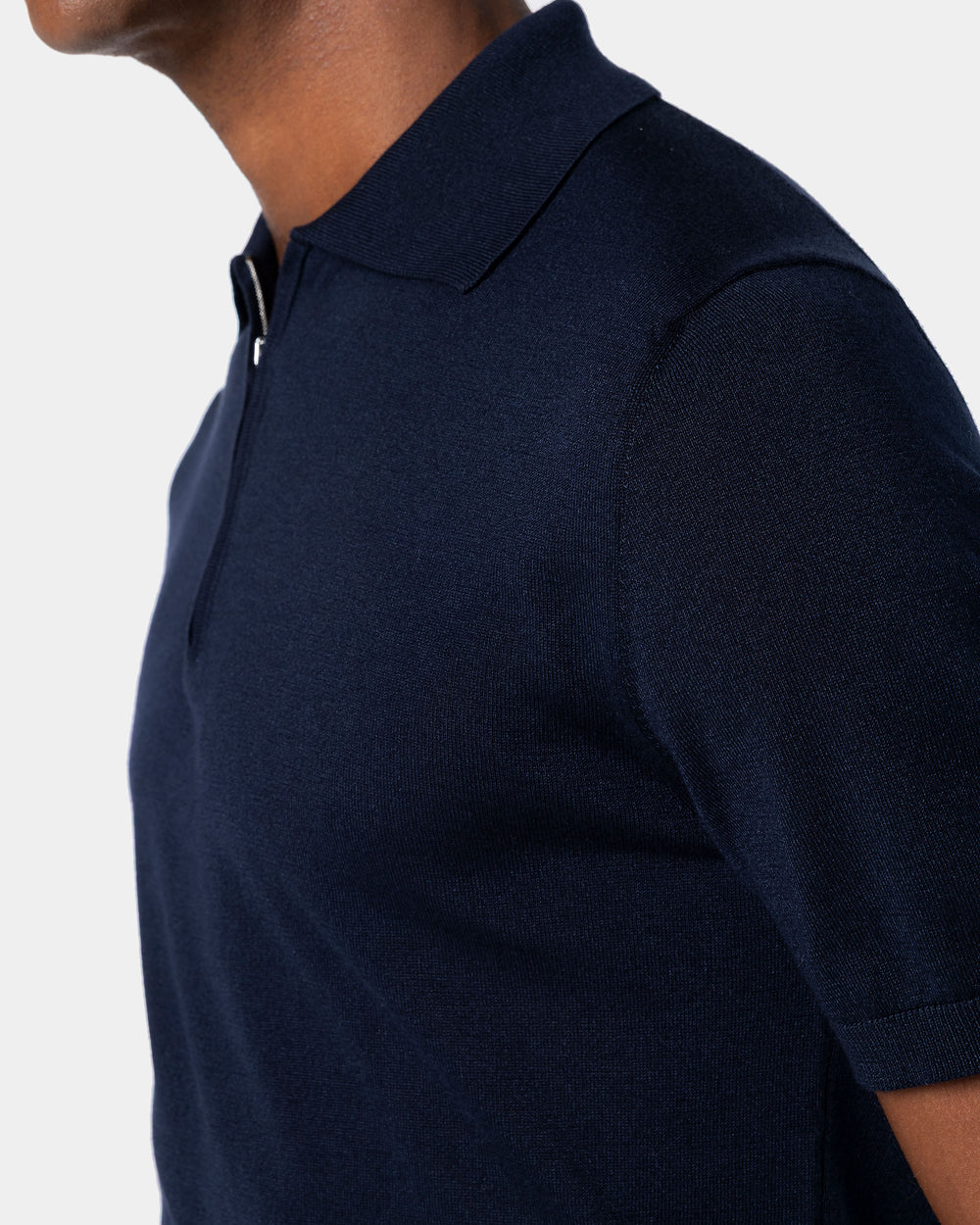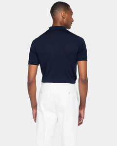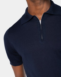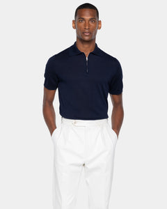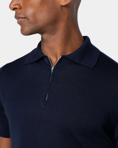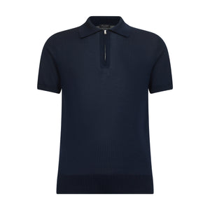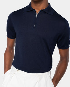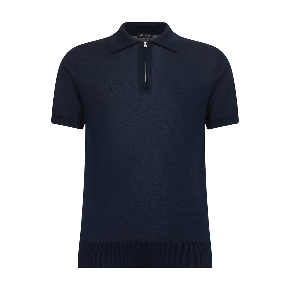 Tailor-made half-sleeve blue-colored zip polo with 15 cm nickel-free Riri zip, made from a luxurious, shiny, and soft combination of ultra-fine organic cotton and Mulberry silk, the rarest in the world, in a custom-knitted single-thread fabric with a gauge of 1/30,000.