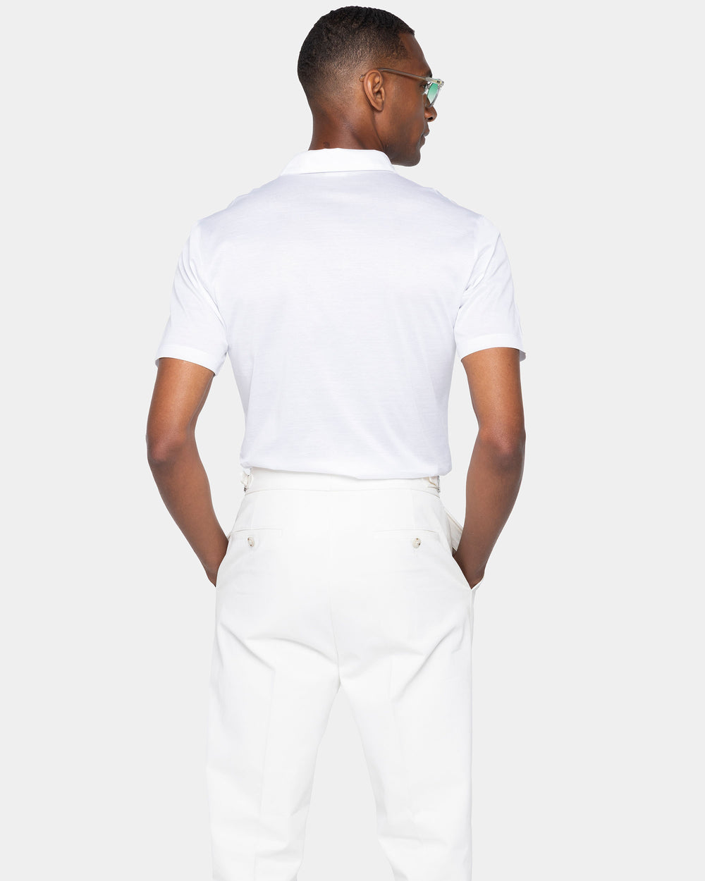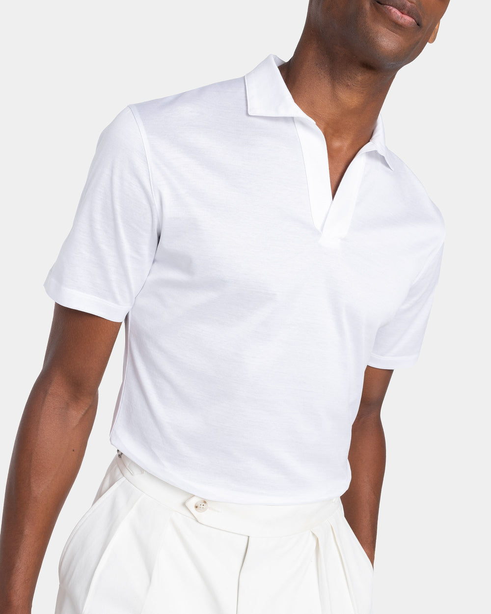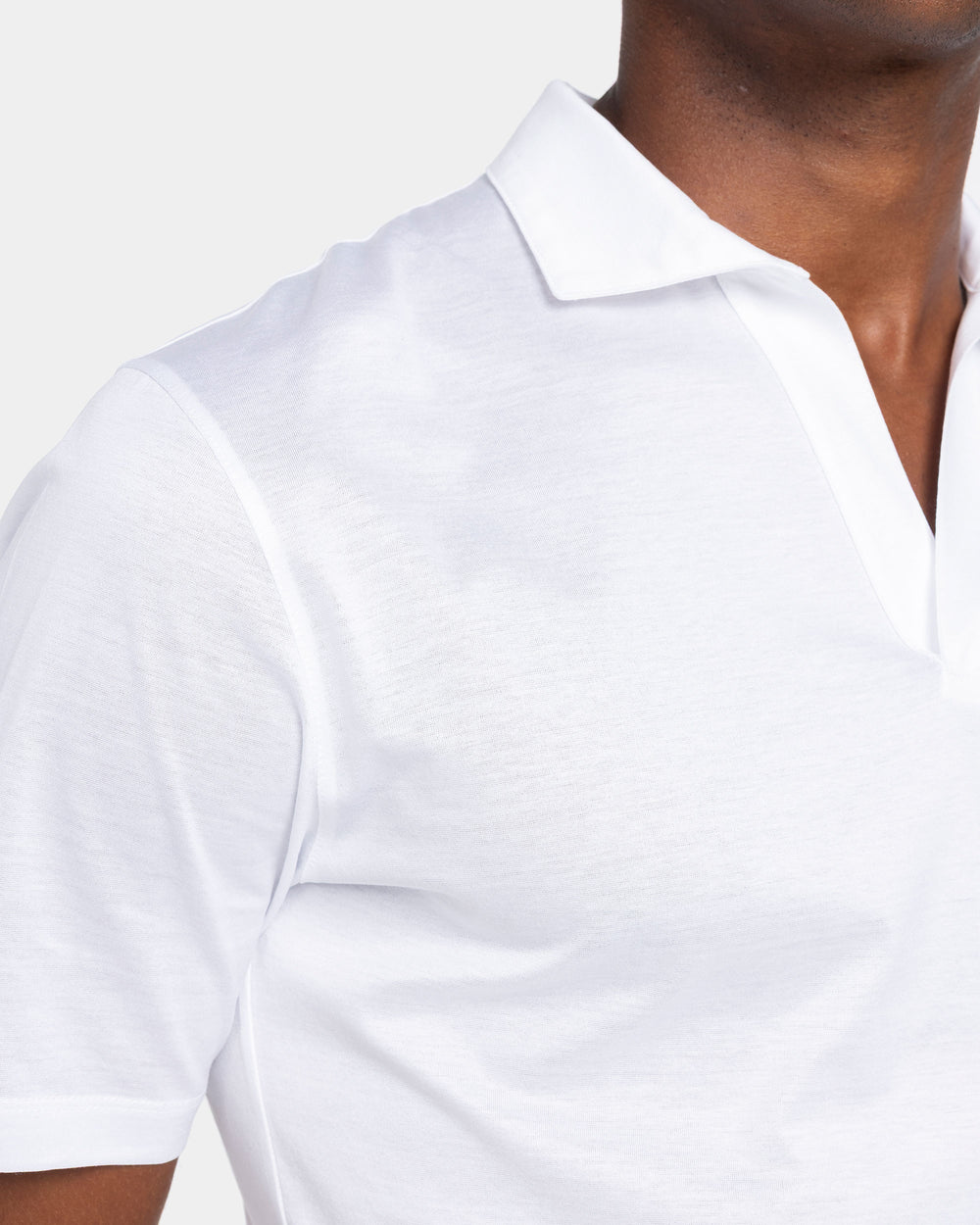 Made of 100% extra-fine 80/2 yarn-dyed jersey Filoscozia® Makò Egiziano cotton from the Italian weaving Tessilmaglia, this buttonless polo stands out for its lightness, sheen, and smooth, flowing hand: an essential and versatile piece designed for the contemporary wardrobe.