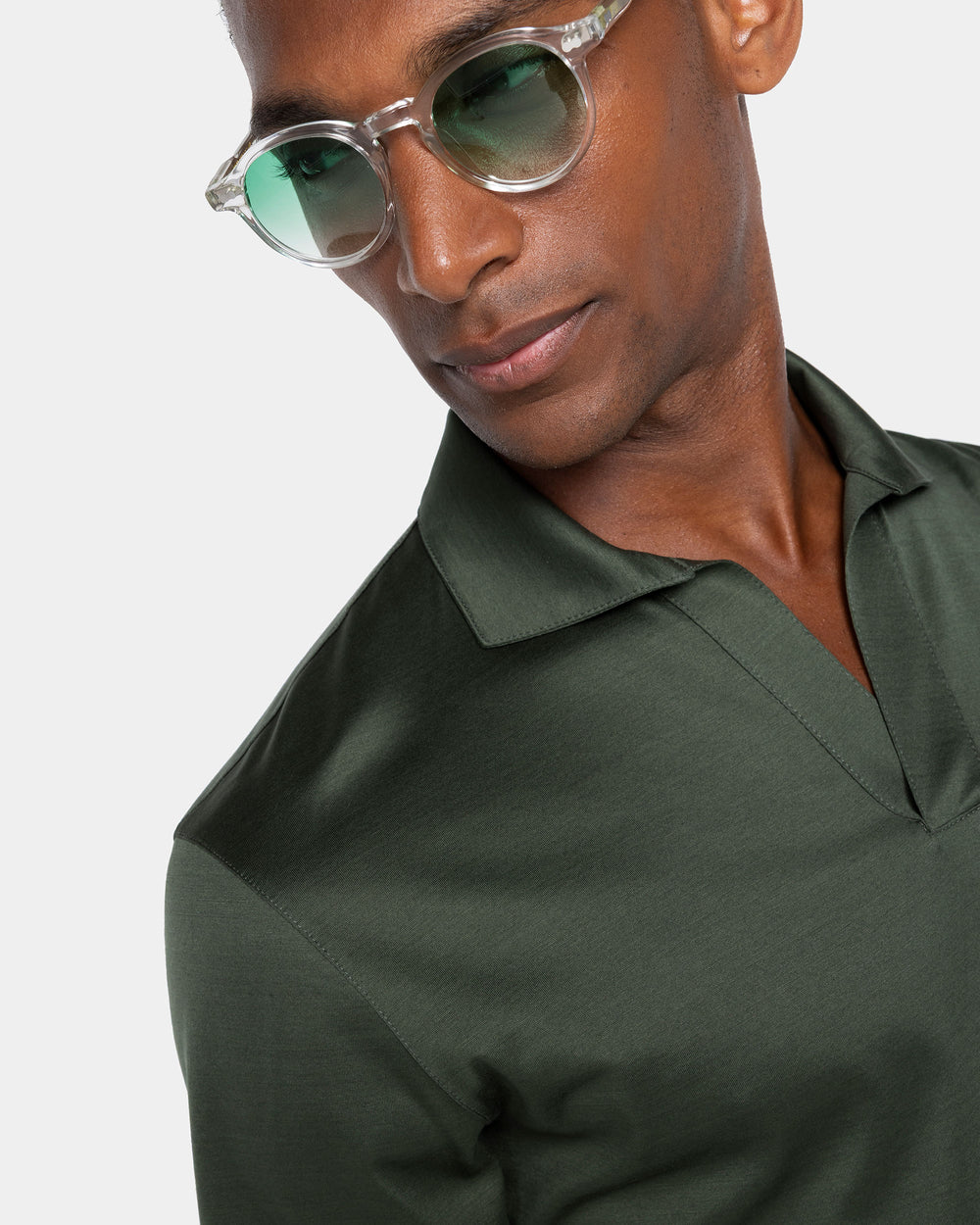 Made of 100% extra-fine 80/2 yarn-dyed jersey Filoscozia® Makò Egiziano cotton from the Italian weaving Tessilmaglia, this buttonless polo stands out for its lightness, sheen, and smooth, flowing hand: an essential and versatile piece designed for the contemporary wardrobe.
