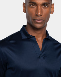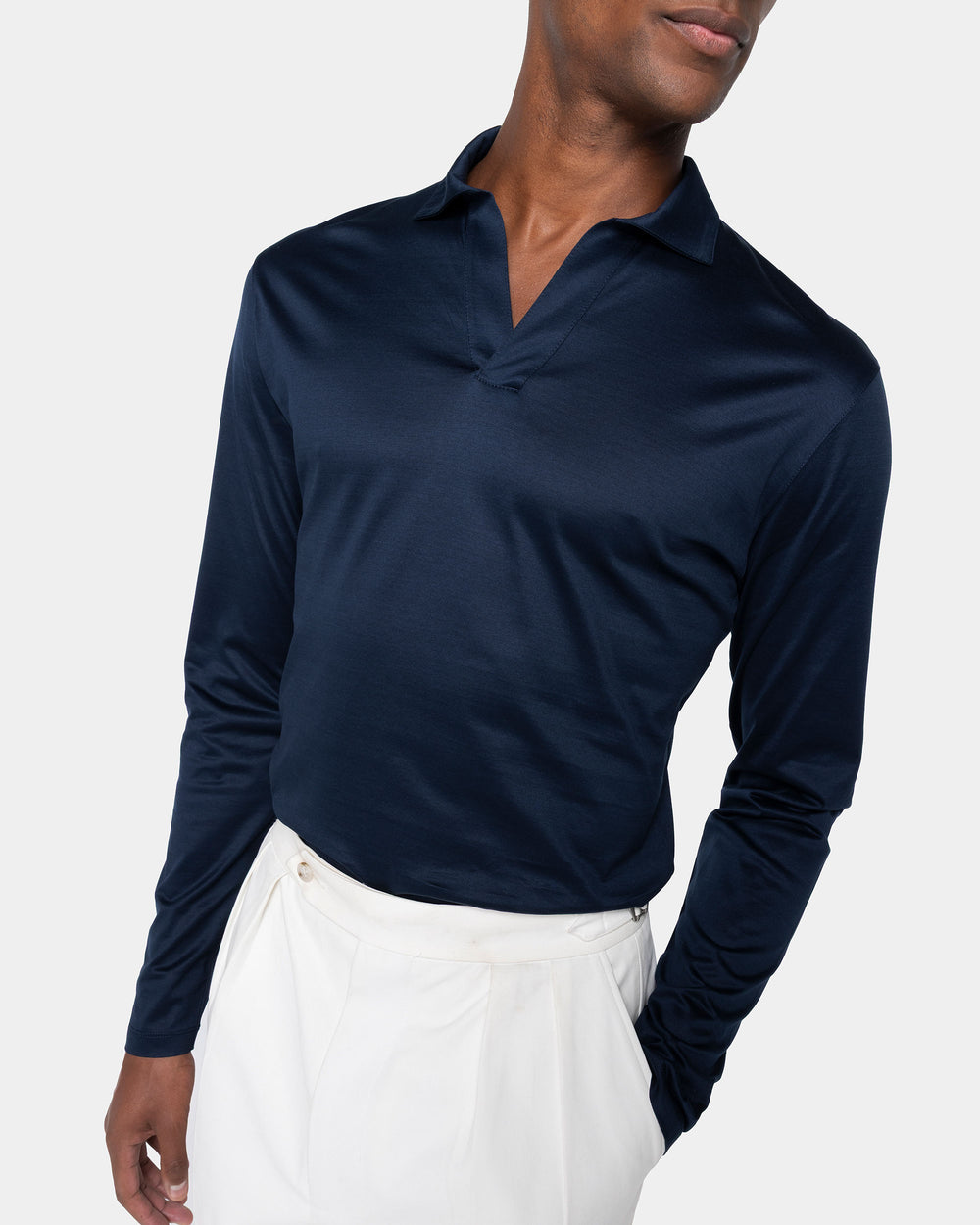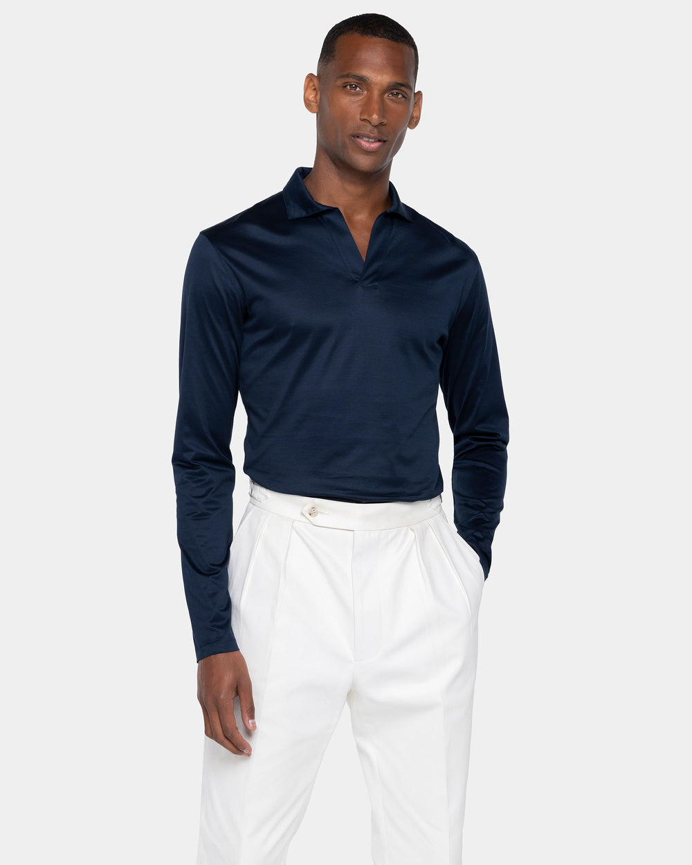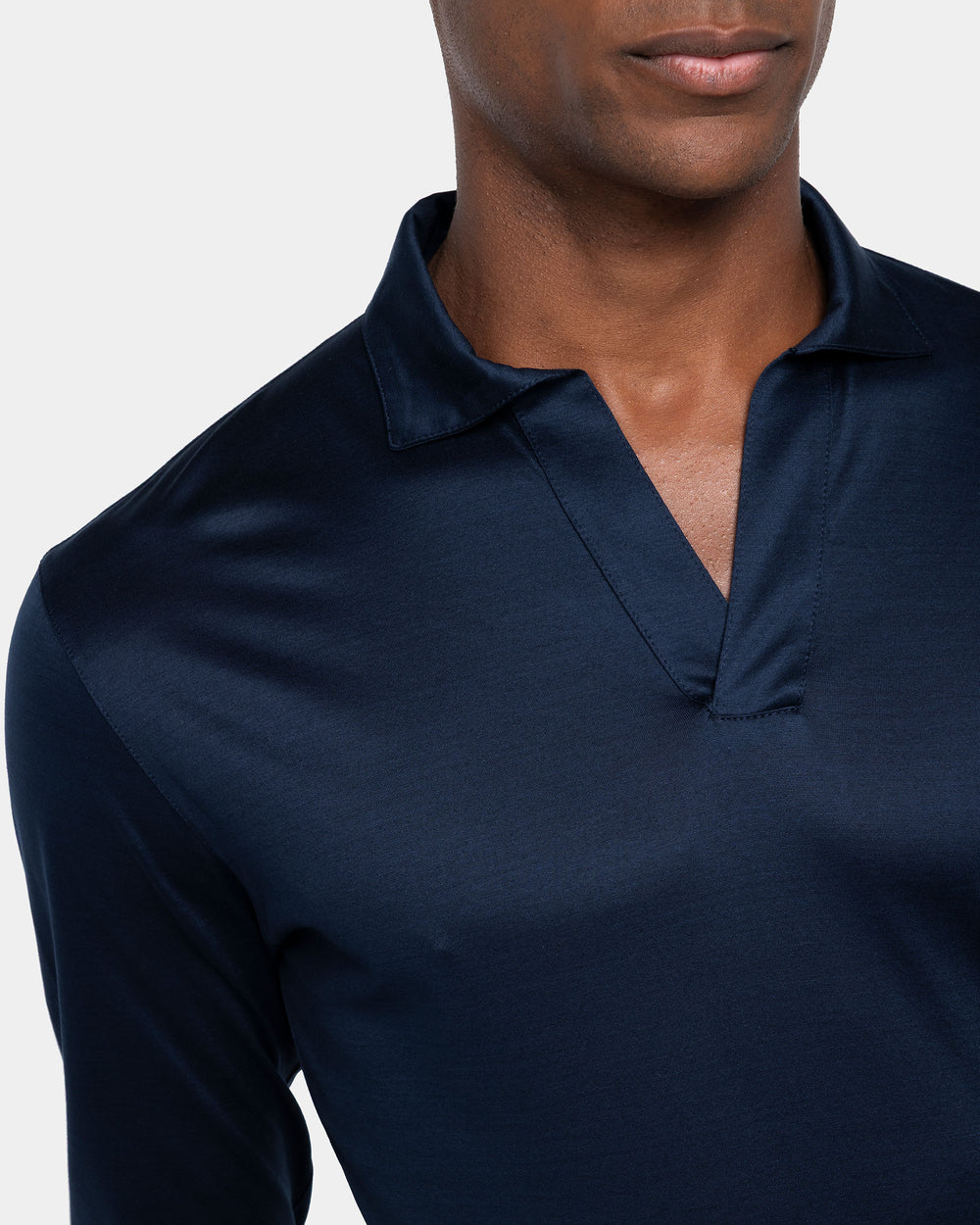 Made of 100% extra-fine 80/2 yarn-dyed jersey Filoscozia® Makò Egiziano cotton from the Italian weaving Tessilmaglia, this buttonless polo stands out for its lightness, sheen, and smooth, flowing hand: an essential and versatile piece designed for the contemporary wardrobe.