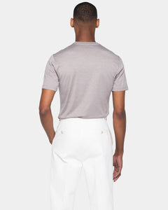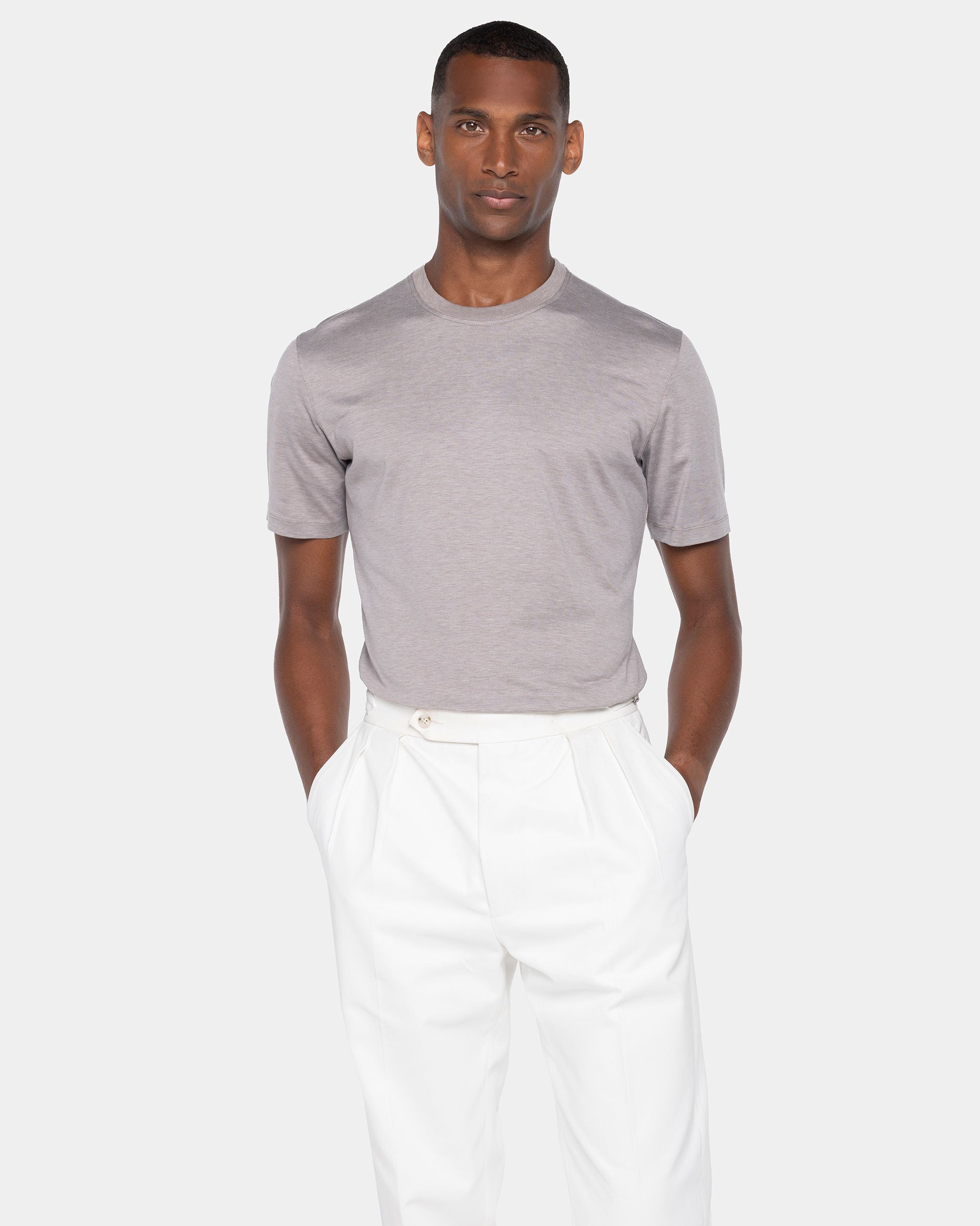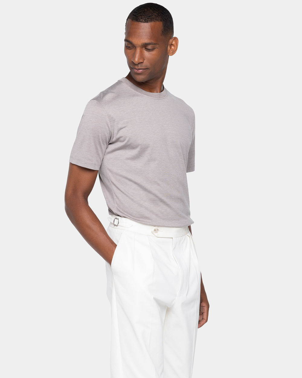 Crafted in the luxurious blend of 60% Mulberry Silk and 40% Organic Cotton jersey 2/115,000, knitted on a 28-gauge frame in white from the Italian weaving mill Maglificio Maggia, it boasts an extraordinarily soft handfeel and a semi-matte appearance. Combining the freshness of cotton with the lightness and luminosity of silk, it evokes the summer atmospheres of remote islands and the decidedly relaxed spirit of our collections.
