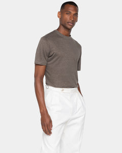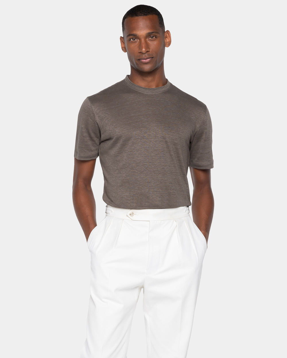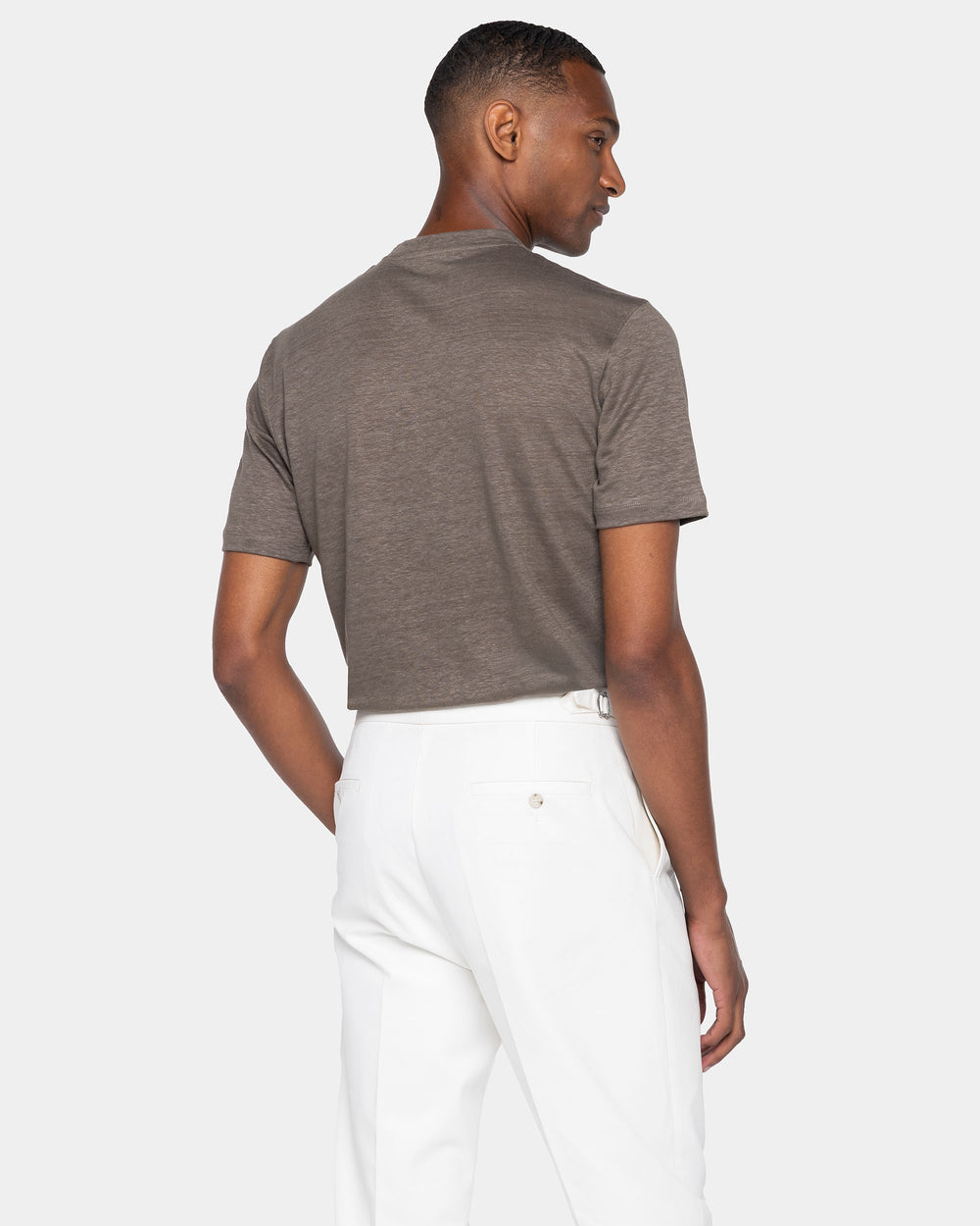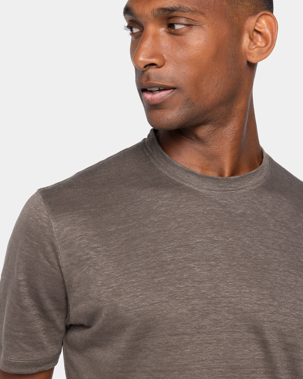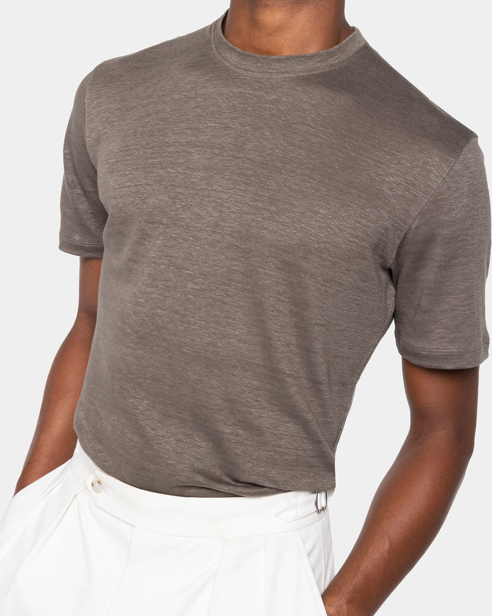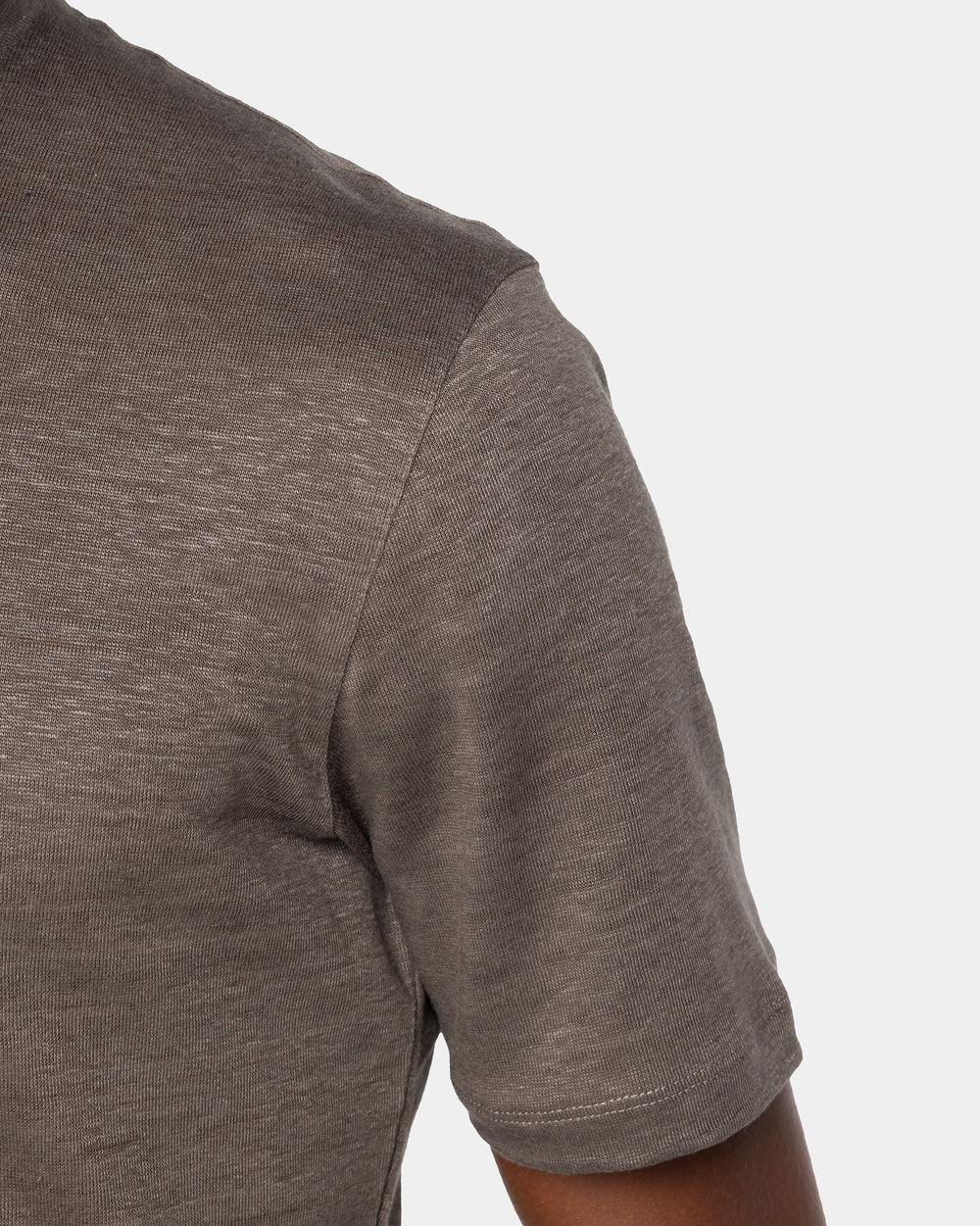 Expertly knitted on circular looms, the Masters of Linen® jersey is extraordinarily lightweight and airy, providing freshness and comfort even on the hottest days. Its subtly slubbed surface and melange effect lend the piece a refined, textural elegance.