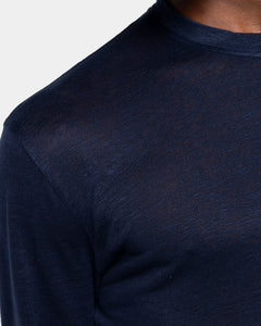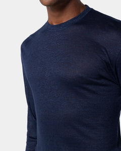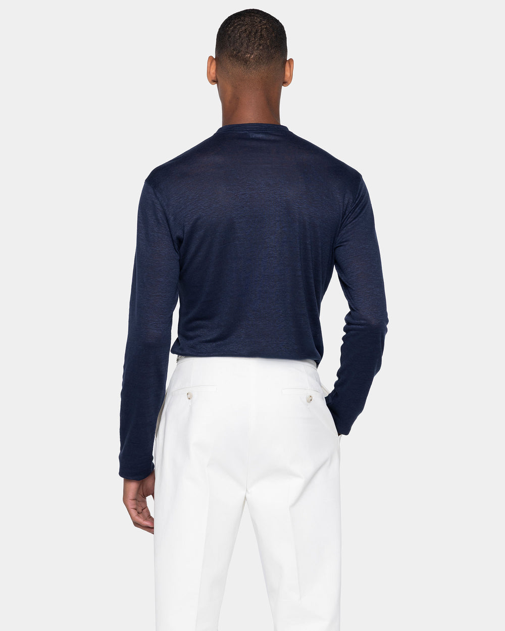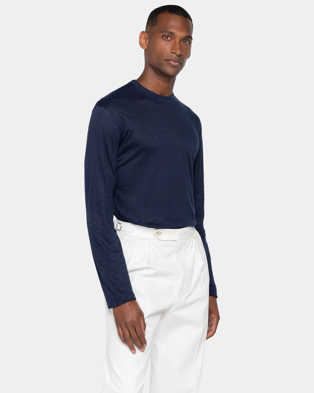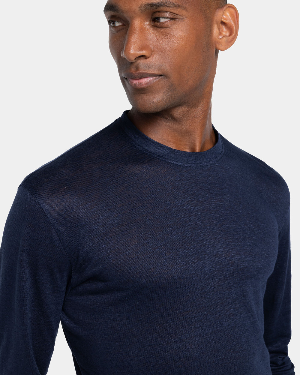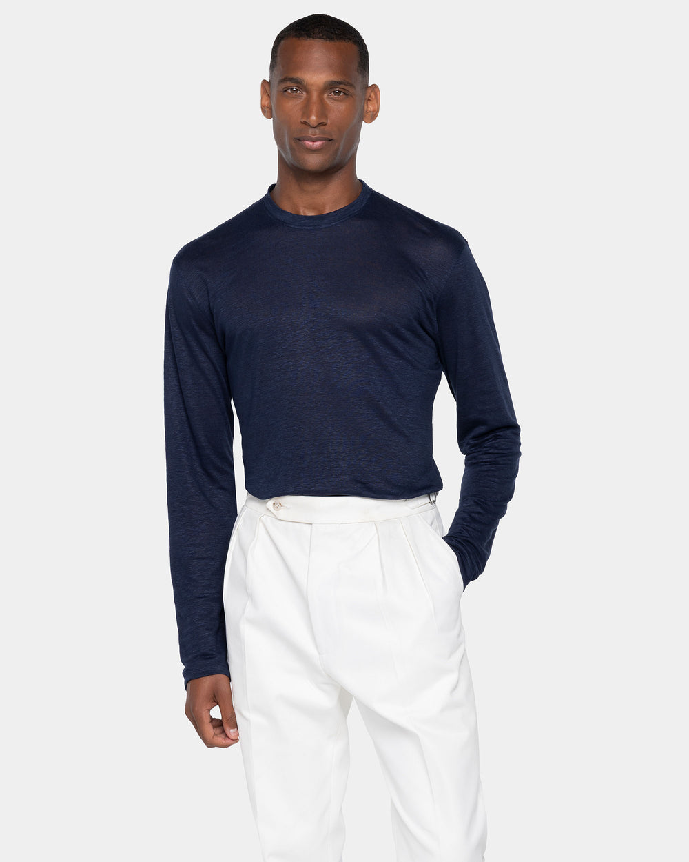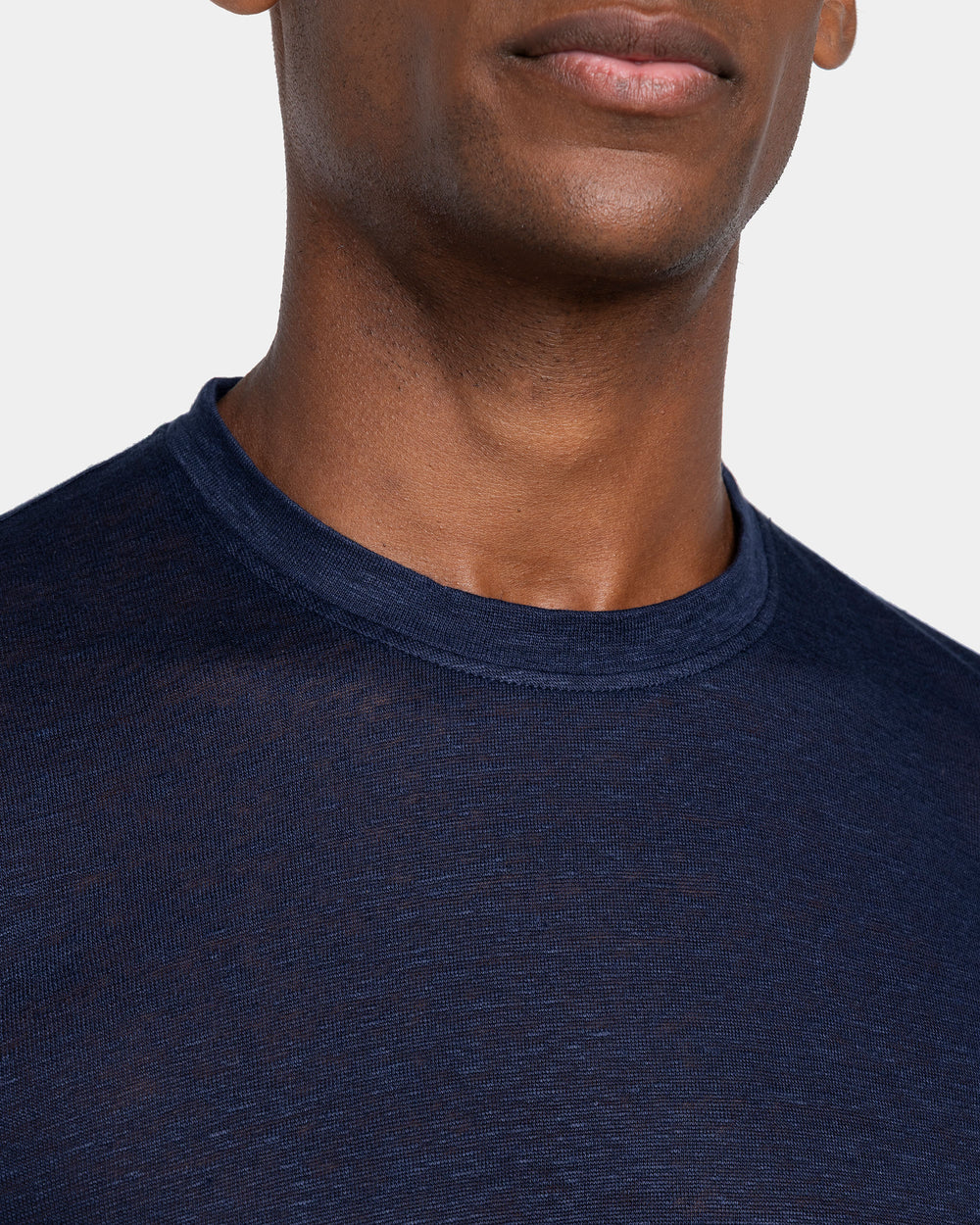 Expertly knitted on circular looms, the Masters of Linen® jersey is extraordinarily lightweight and airy, providing freshness and comfort even on the hottest days. Its subtly slubbed surface and melange effect lend the piece a refined, textural elegance.