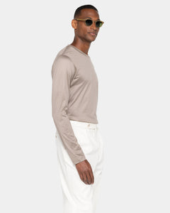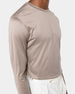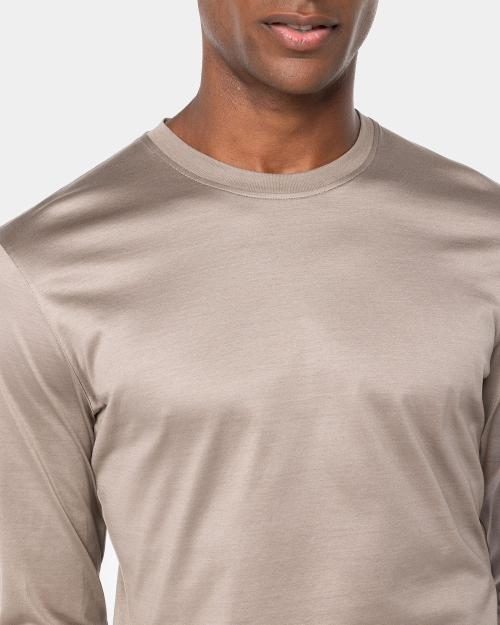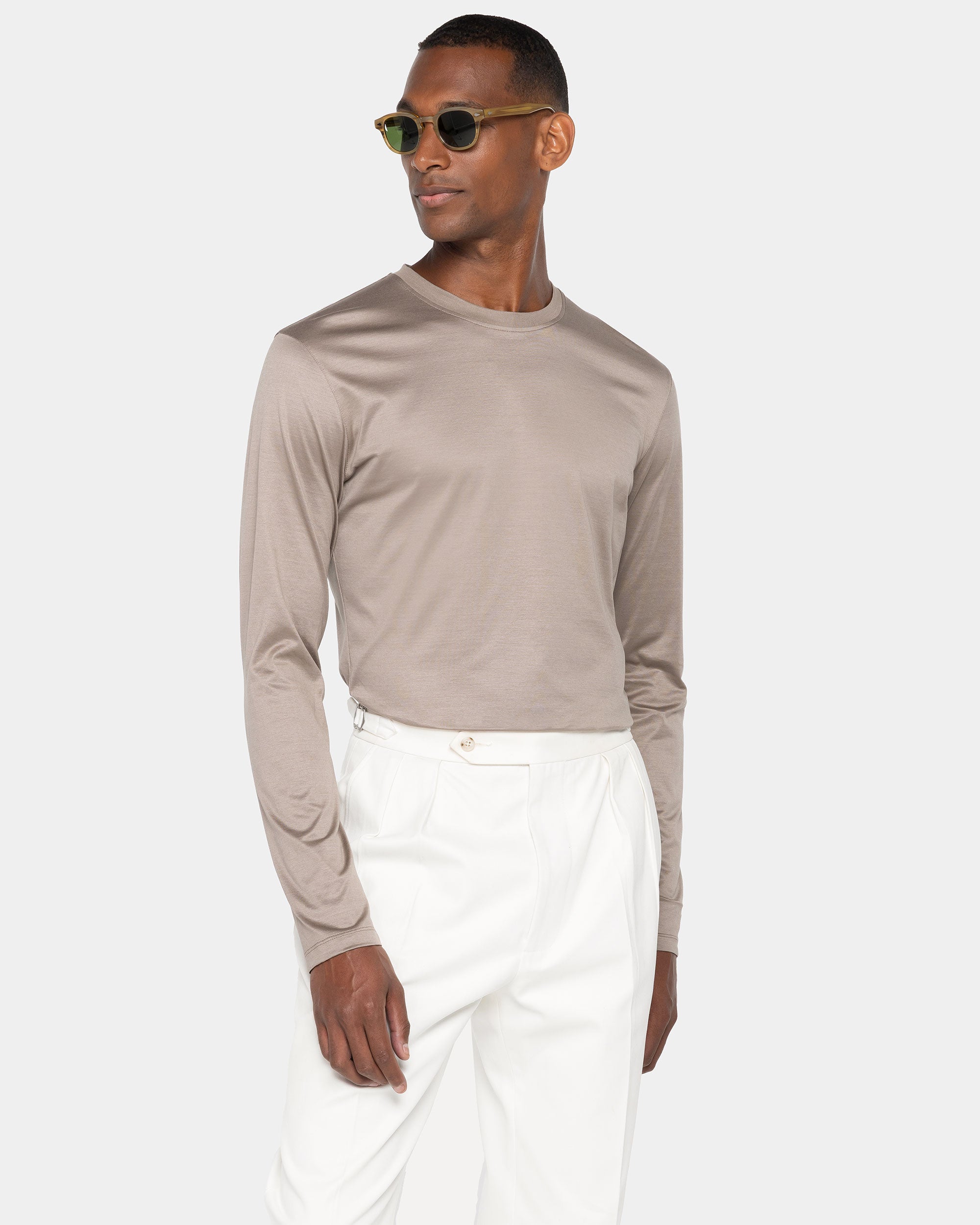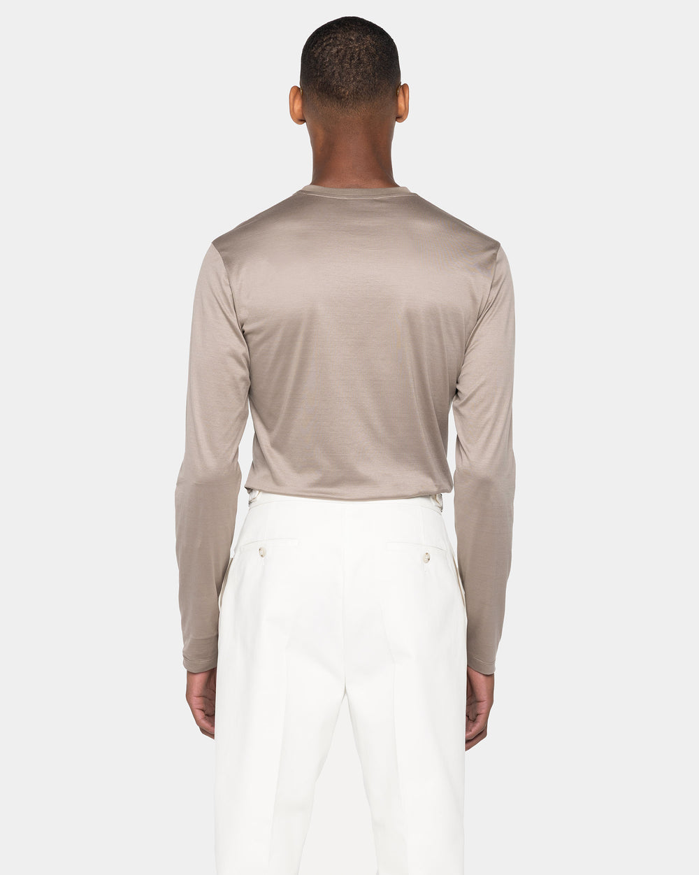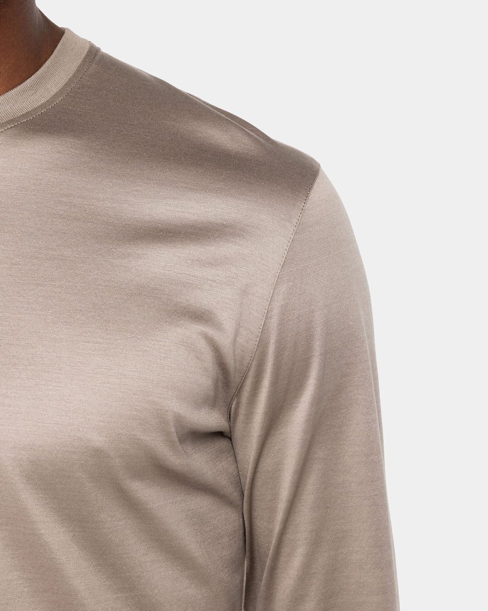 Made of 100% extra-fine 80/2 yarn-dyed jersey Filoscozia® Makò Egiziano cotton from the Italian weaving Tessilmaglia, it is light, bright and with a smooth and flowing hand, and is a precious pass part out of the contemporary wardrobe. This garment is the result of Filatori's loyalty to the pursuit of excellence and is characterized by high attention to finishes and details. The visible stitching under the neckline and on the shoulder lend a touch of additional tailoring to the garment.