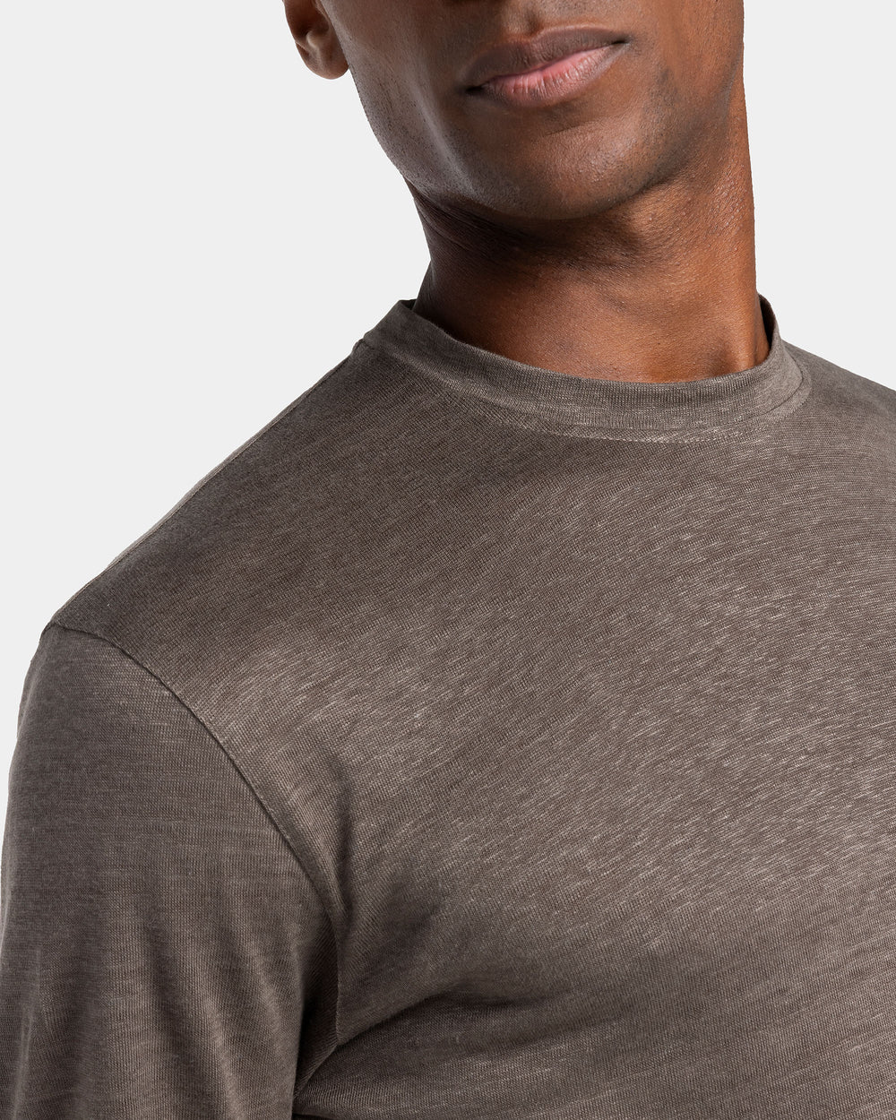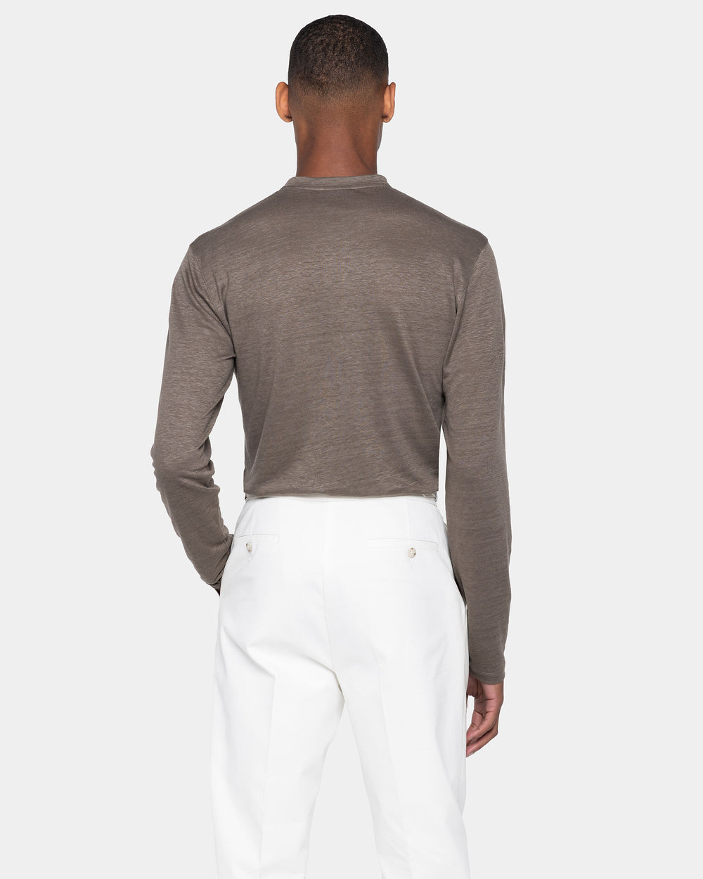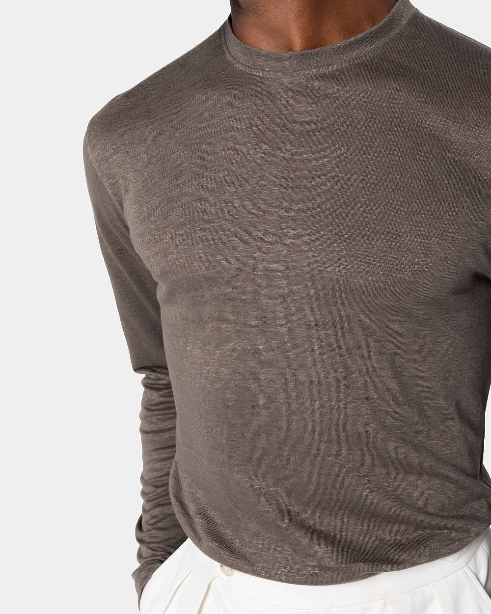 Expertly knitted on circular looms, the Masters of Linen® jersey is extraordinarily lightweight and airy, providing freshness and comfort even on the hottest days. Its subtly slubbed surface and melange effect lend the piece a refined, textural elegance.
