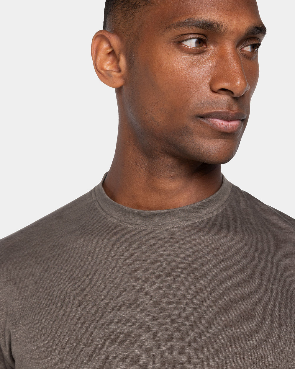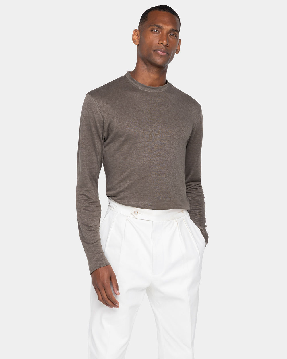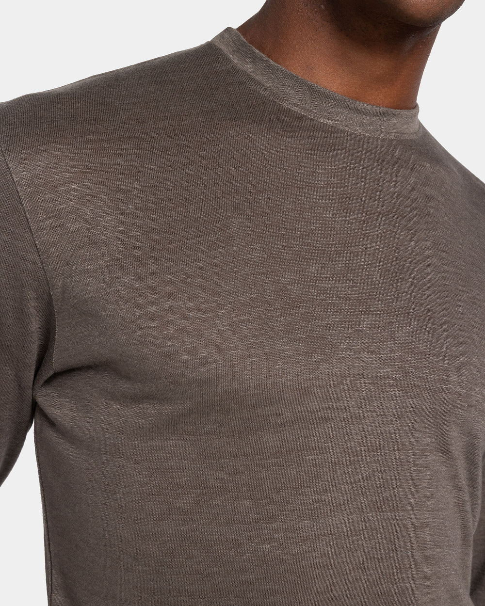 Expertly knitted on circular looms, the Masters of Linen® jersey is extraordinarily lightweight and airy, providing freshness and comfort even on the hottest days. Its subtly slubbed surface and melange effect lend the piece a refined, textural elegance.